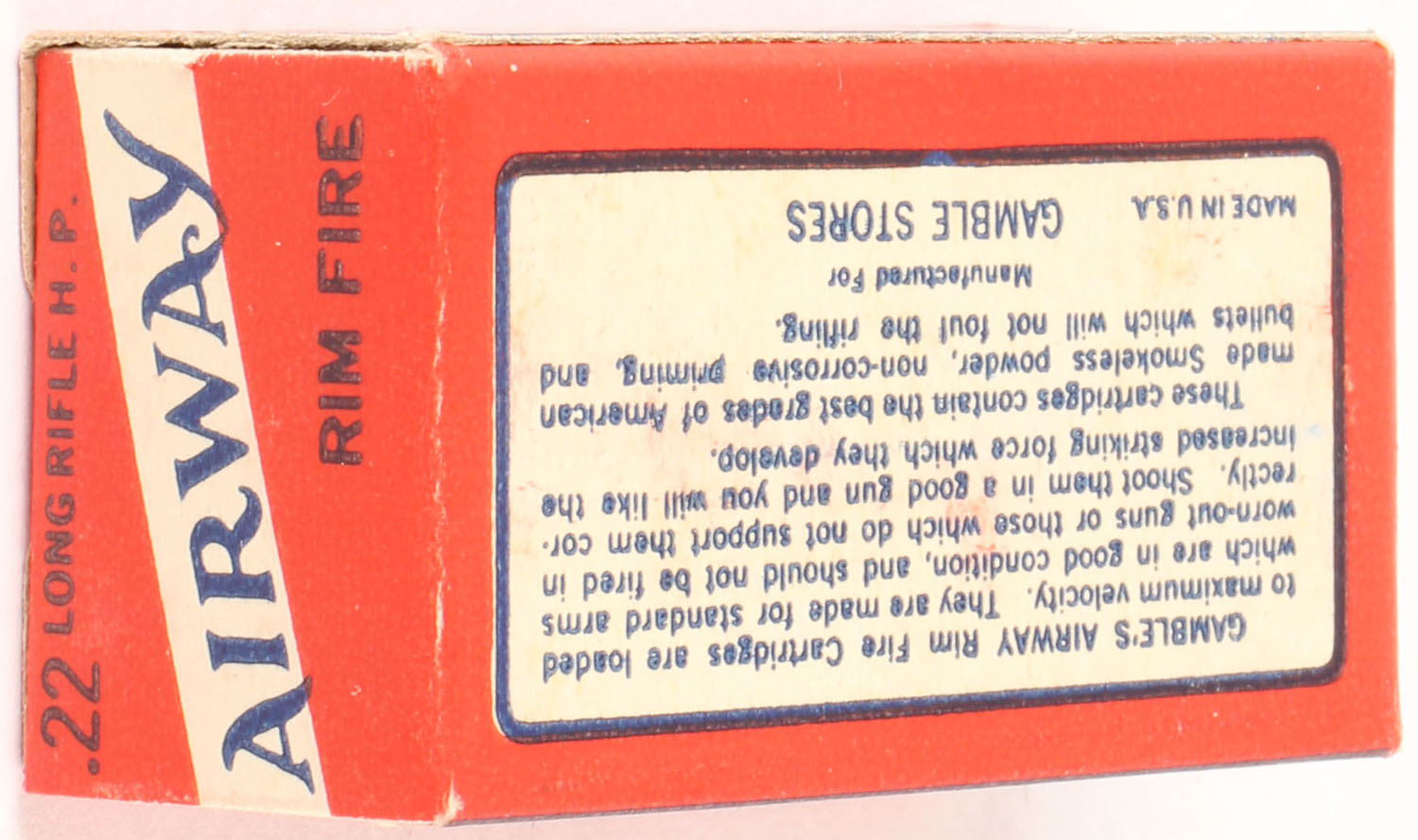 Gambles, Airway, .22 Long Rifle Hollow Point, RHWeb: GS-1 LR-2a, Full, 1pc. Red blue & white box, box is MINT with minty color, corners are sharp, edges are crisp, end flaps are solid, ammo is minty. Grade: MINT - Value: 30 to 45