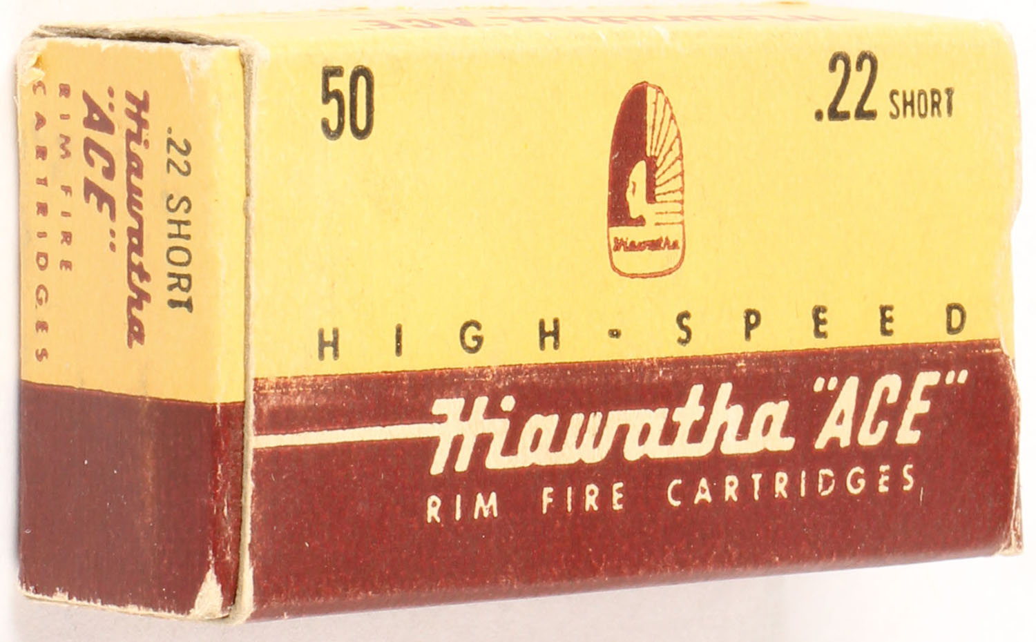 Gambles, Hiawatha ''Ace'', .22 Short, High-Speed, RHWeb: GS-2 S-1, Partial 44rds. 1pc. Yellow & brown box, box is solid with excellent color, very minor corner wear, edges are crisp, end flaps are solid, ammo is excellent. Grade: Excellent - Value: 10 to 15