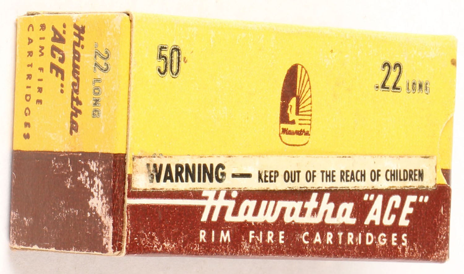Gambles, Hiawatha ''Ace'', .22 Long, RHWeb: GS-3 L-1, Full, 1pc. Yellow & brown box with white child warning label, box is solid with excellent color, minor shelf wear, very minor age soiling & corner wear, edges are crisp, end flaps are solid, child warning label has slightly started to peel, ammo is excellent. Grade: Very Good ++ - Value: 16 to 24