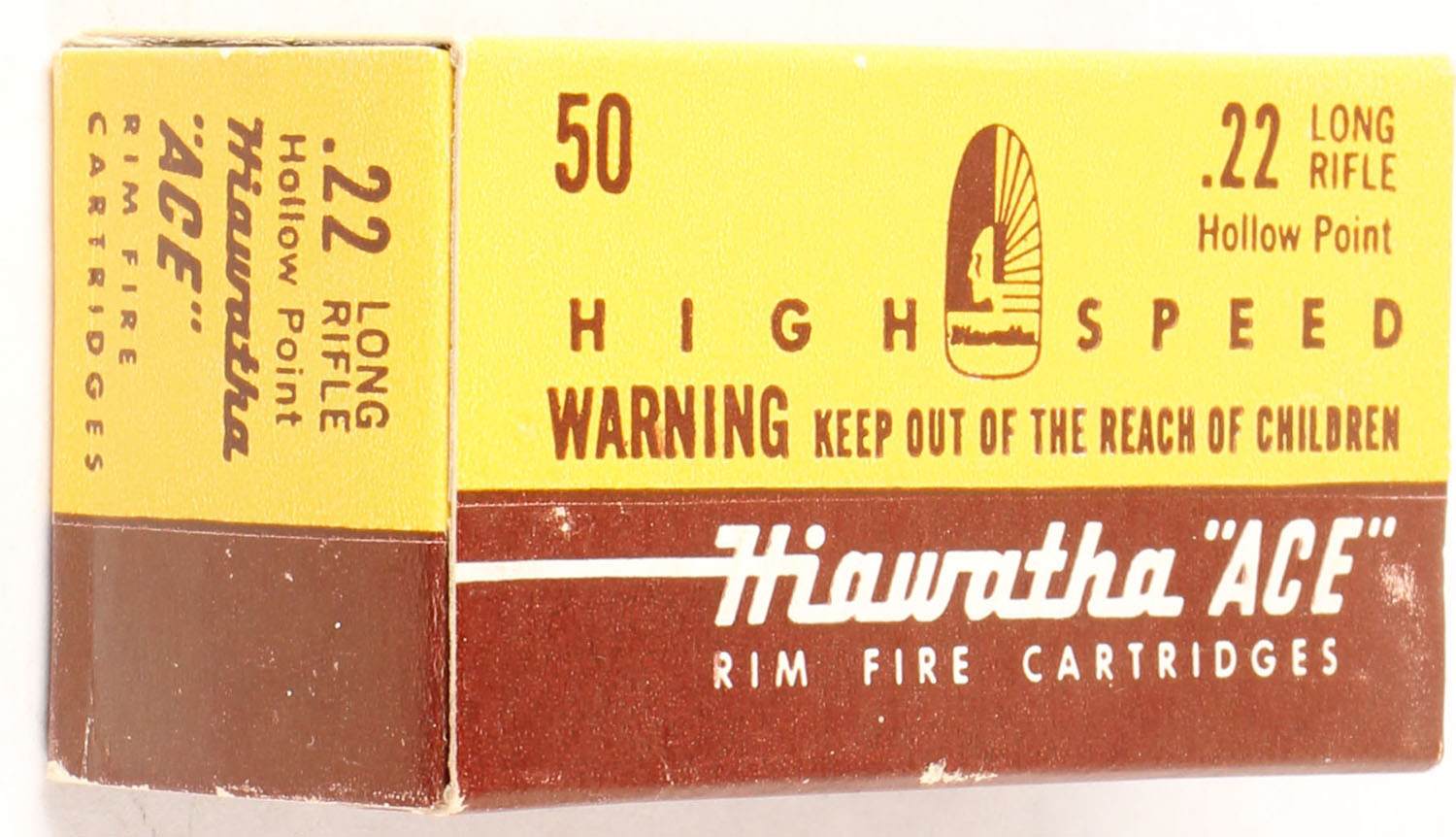 Gambles, Hiawatha ''Ace'', .22 Long Rifle Hollow Point, RHWeb: GS-4 LR-2, Full, 1pc. Yellow & brown box, box is near mint with minty color, only very minor edge wear, corners are mostly sharp, edges are crisp, end flaps are solid, ammo is excellent. Grade: Excellent ++ - Value: 24 to 36