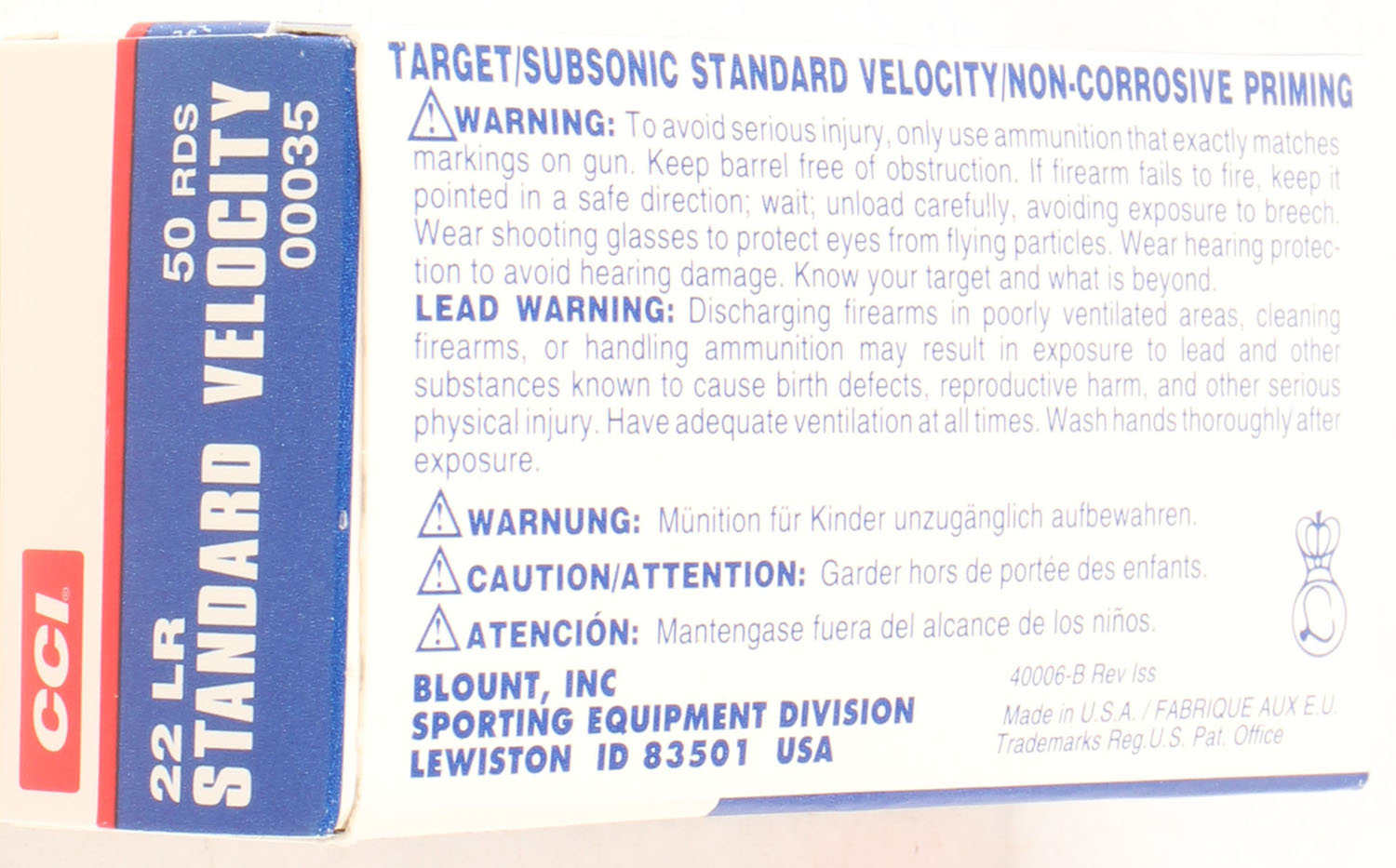 CCi, Standard Velocity, .22 Long Rifle, RHWeb: CCI-8 LR-15a, Full, 1pc. Blue white & red box, box is MINT with minty color, corners are sharp, edges are crisp, end flaps are solid, ammo is mint. Grade: MINT - Value: 12 to 18