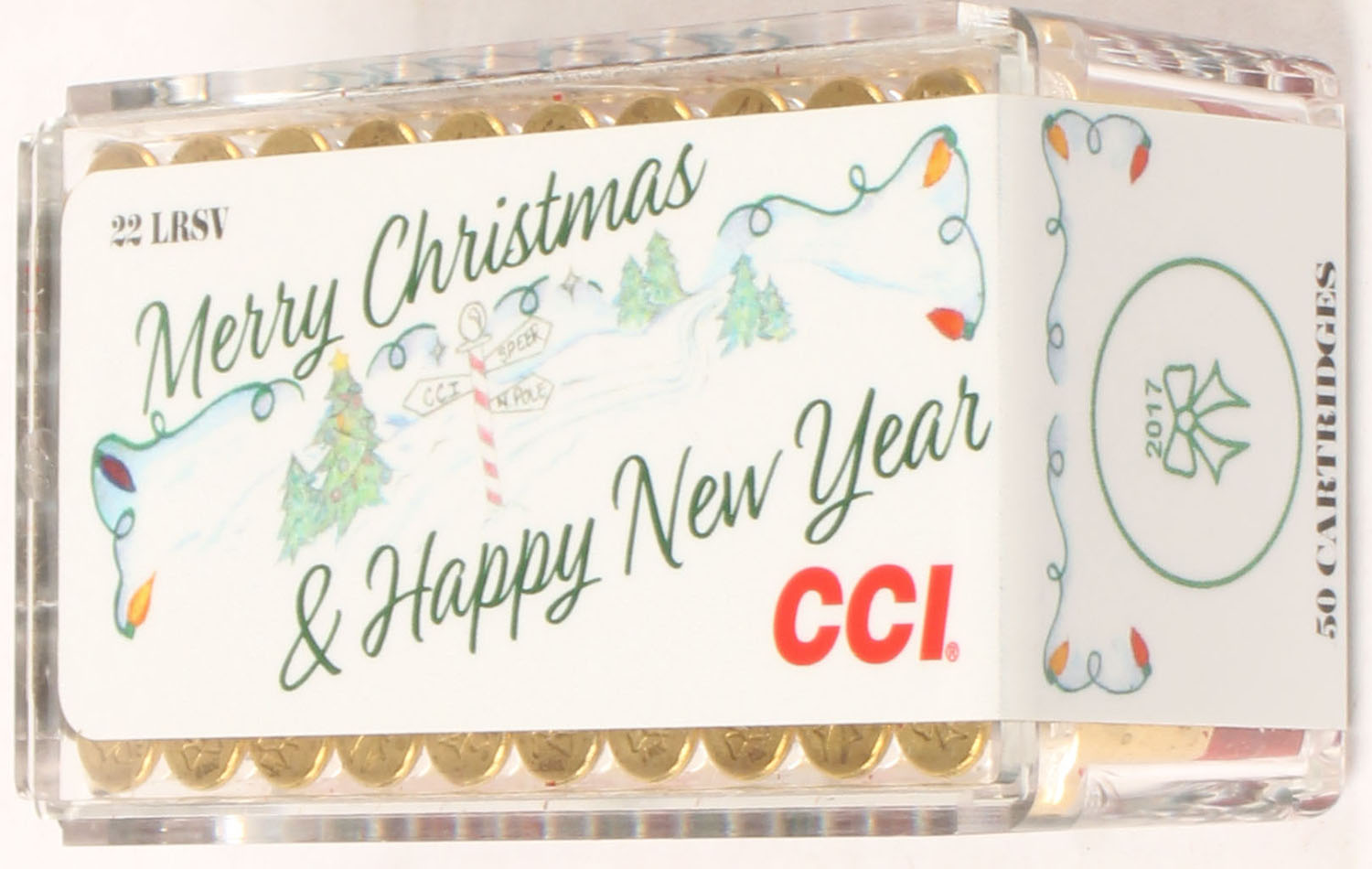 CCi, Merry Christmas 2017, .22 Long Rifle, Standard Velocity, FULL & SEALED, 2pc. Clear plastic tray with label featuring a festive Christmas scene, tray is clean & clear, label is intact with minty color. Grade: MINT - Value: 50 to 75