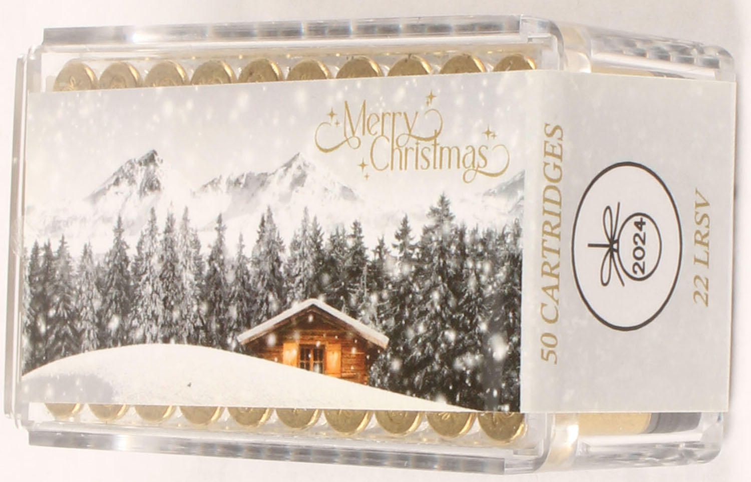 CCi, Merry Christmas 2024, .22 Long Rifle, Standard Velocity, FULL & SEALED, 2pc. Clear plastic tray with label featuring a snowy winter mountain cabin, tray is clean & clear, label is intact with minty color. Grade: MINT - Value: 50 to 75
