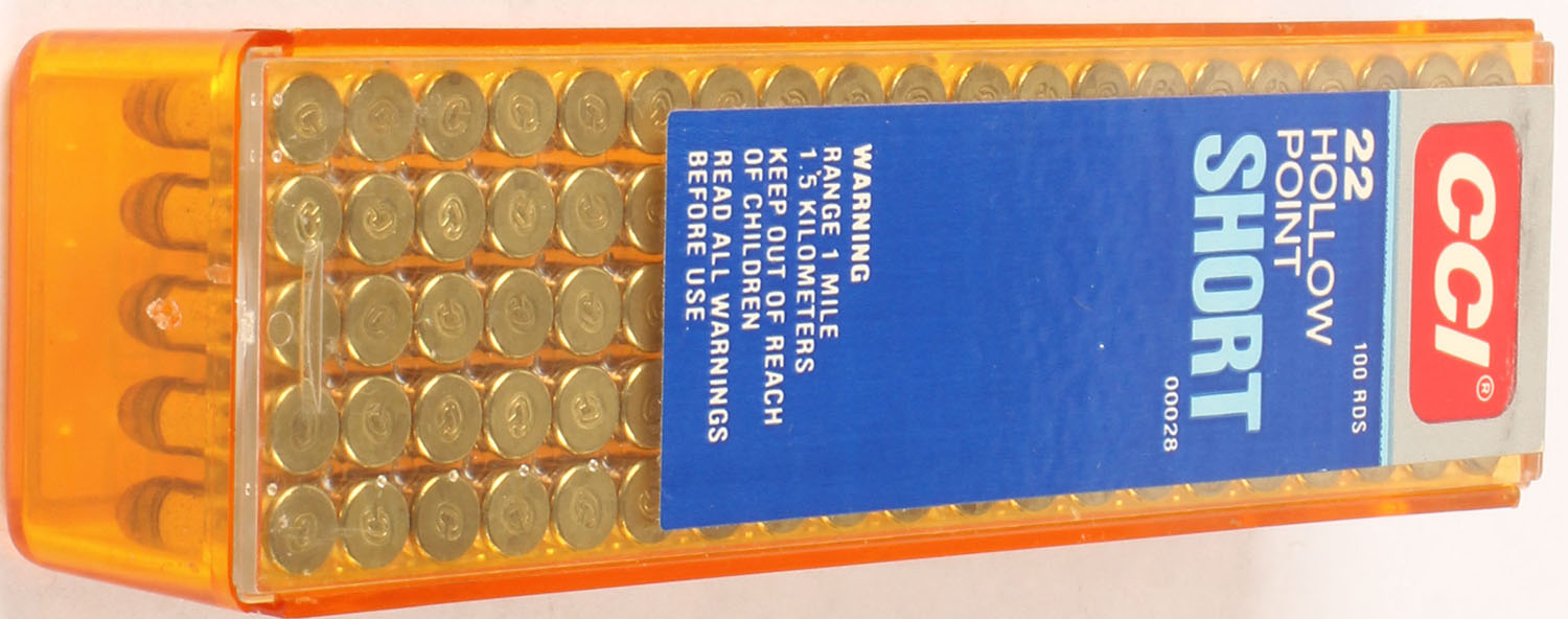 CCi, .22 Short Hollow Point, RHWeb: CCI-6.1 S-2, FULL & SEALED, 2pc. Amber plastic tray with blue & silver sealing label, box is near mint with excellent to minty color, only very minor age soiling, label is intact, ammo appears minty. Grade: Excellent ++ - Value: 12 to 18