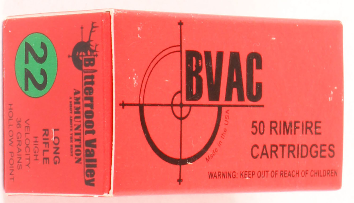 Bitterroot Valley, .22 Long Rifle Hollow Point, High Velocity, RHWeb: BVAC-1 LR-1, Full, 1pc. Red & black box, box is MINT with minty color, sharp corners, crisp edges, rigid end flaps, ammo is mint. Grade: MINT - Value: 12 to 18