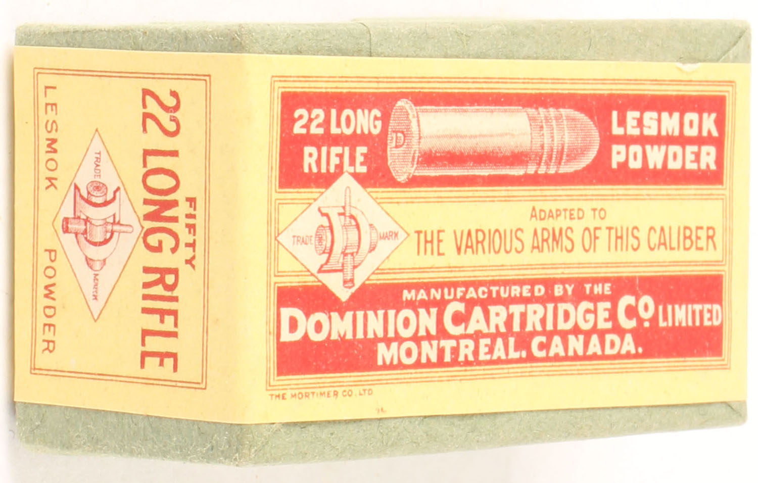 Dominion, Lesmok Powder, .22 Long Rifle, RHWeb: (Canada) D-3 LR-3b, Full, 2pc. Blue box with yellow & red wraparound label, box is MINT with minty color, corners are sharp, edges are crisp, label is intact. Grade: MINT - Value: 100 to 150