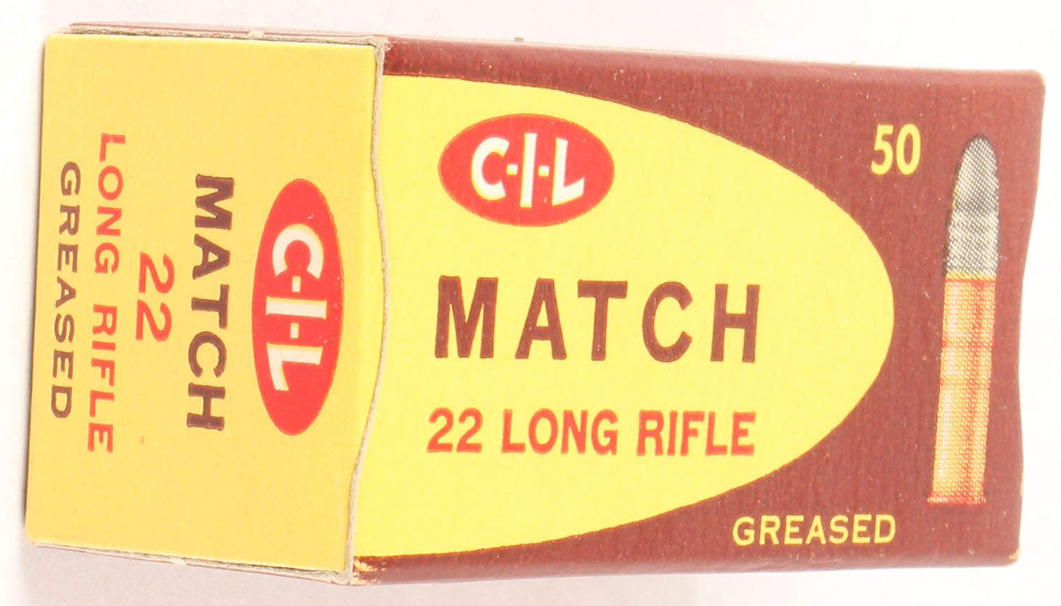 C.I.L., Match, .22 Long Rifle, Greased, RHWeb: CIL-5 LR-5, Full, 1pc. Brown & yellow box, box is near mint with minty color, only very minor corner wear, edges are crisp, end flaps are solid, ammo is excellent. Grade: Excellent ++ - Value: 8 to 12