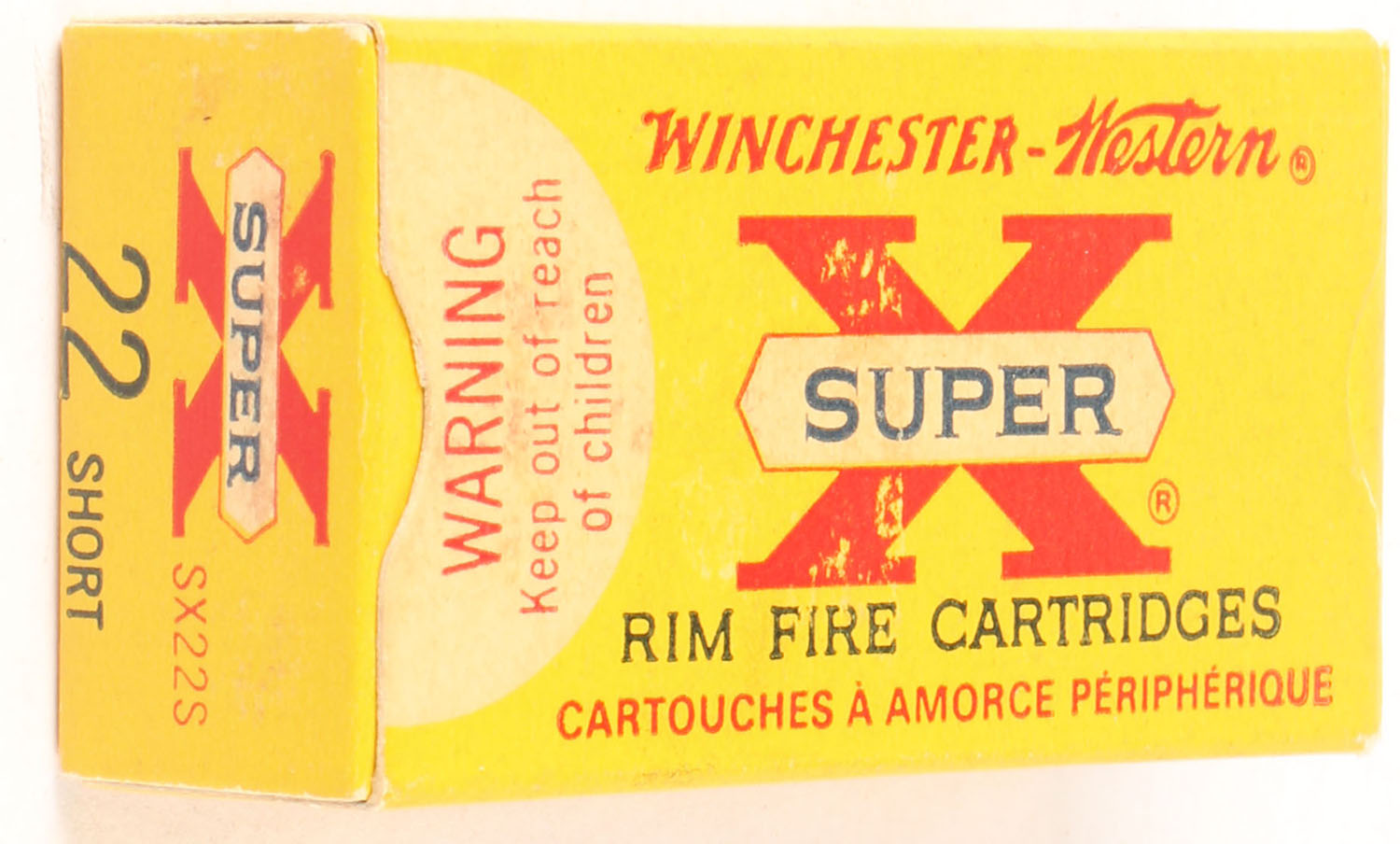 Winchester-Western, Super-X, .22 Short, RHWeb: (Canada) WRA-1 S-1, Full, 1pc. Yellow white & red box, box is solid with very good color, minor age soiling & shelf wear, corners are mostly sharp, edges are crisp, end flaps are solid, ammo is excellent. Grade: Excellent - Value: 30 to 45