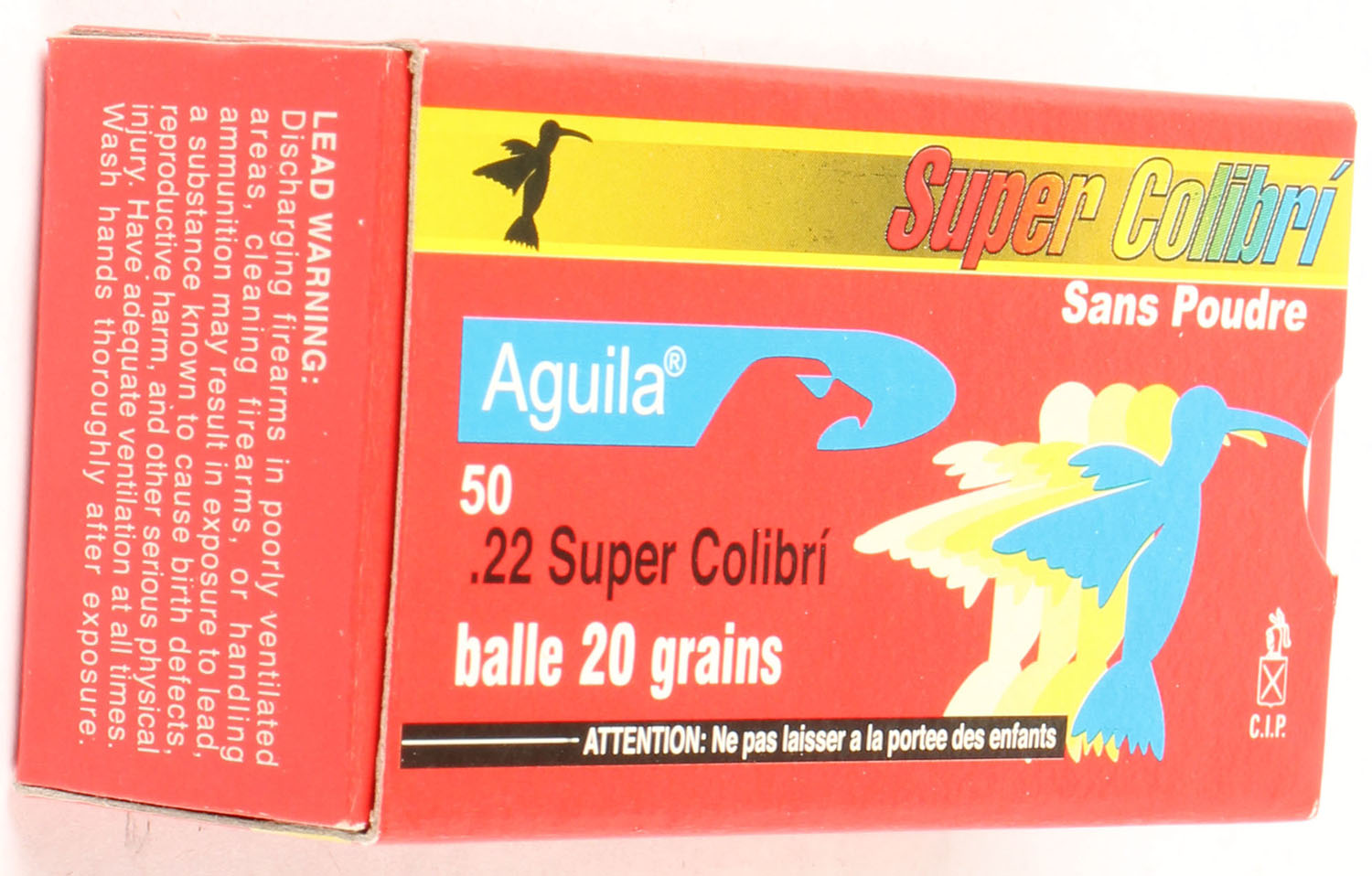 Aguila, Super Colibri, .22 Super Colibri, Powderless, 20 Grain Bullet, Full, 1pc. Multi-colored box, box is MINT with minty color, ammo is mint. Grade: MINT - Value: 6 to 10