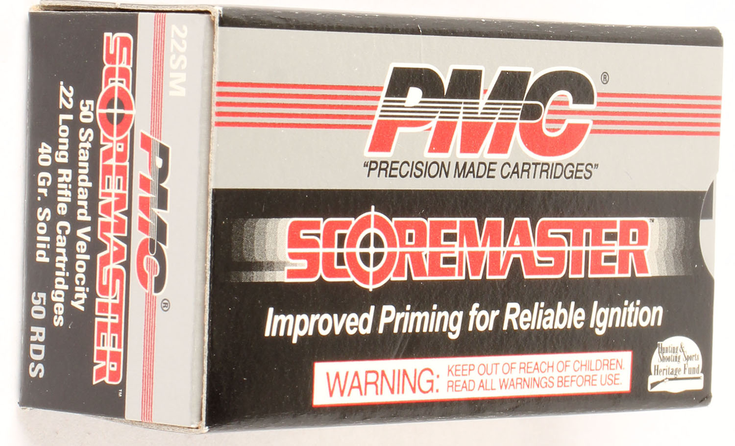 PMC, Scoremaster, .22 Long Rifle, Standard Velocity, 40 Grain Solid, Not in RHWeb, Full, 1pc. Black gray & red box, box is MINT with minty color, corners are sharp, edges are crisp, end flaps are solid, ammo is minty. Grade: MINT - Value: 4 to 10