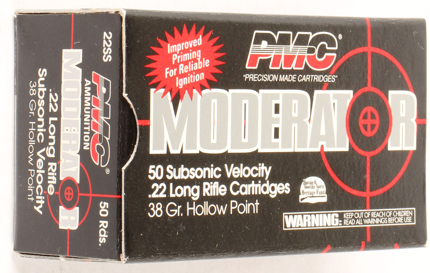 PMC, Moderator, .22 Long Rifle, Subsonic Velocity, 38 Grain Hollow Point, RHWeb: PMC-6 LR-3, Full, 1pc. Black gray & red box, box is MINT with minty color, corners are sharp, edges are crisp, end flaps are solid, ammo is minty. Grade: MINT - Value: 4 to 10