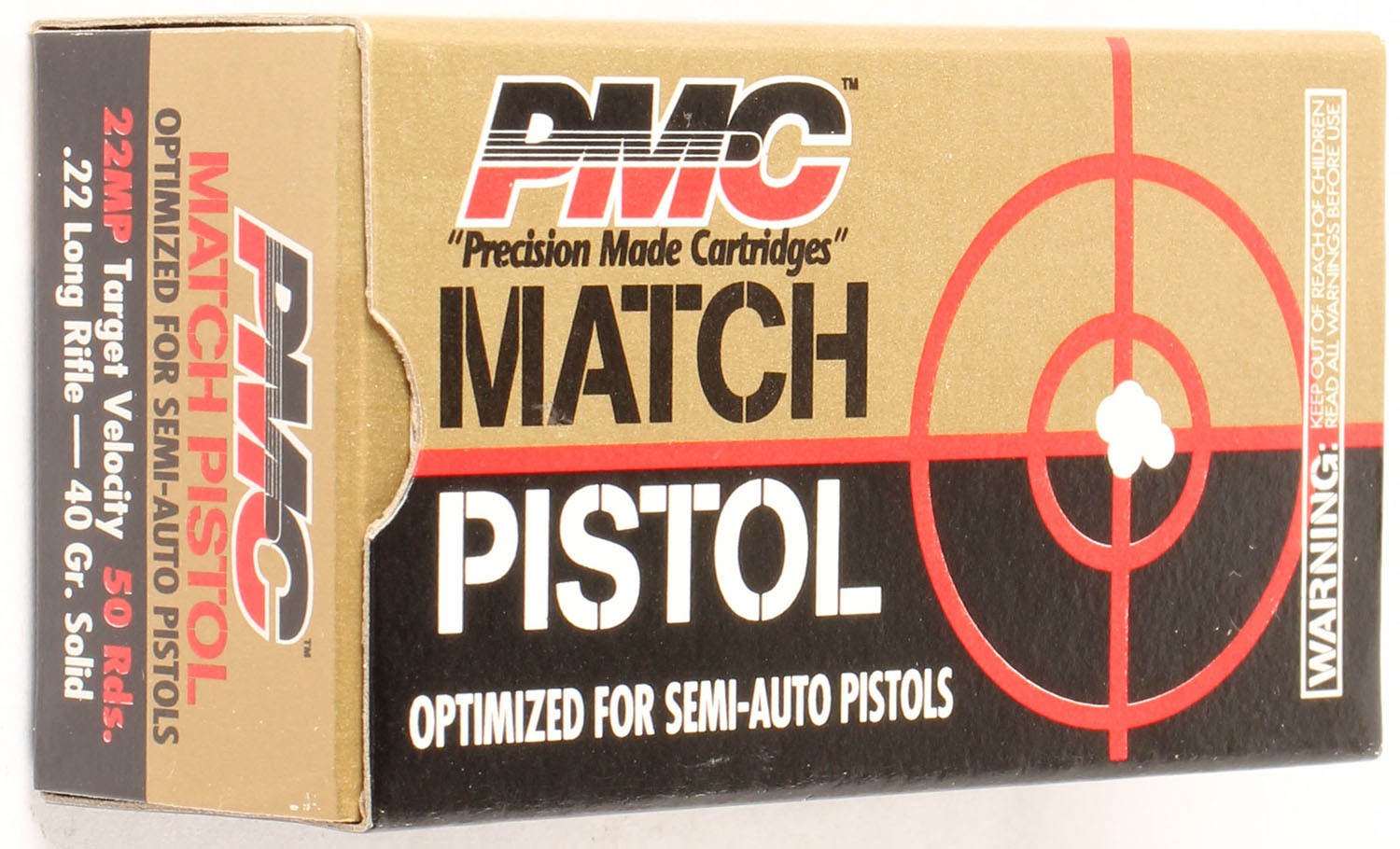 PMC, Match Pistols, .22 Long Rifle, Target Velocity, Optimized for Semi-Auto Pistols, RHWeb: PMC-5 LR-4, Full, 1pc. Black bronze & red box, box is MINT with minty color, corners are sharp, edges are crisp, end flaps are solid, ammo is minty. Grade: MINT - Value: 10 to 15
