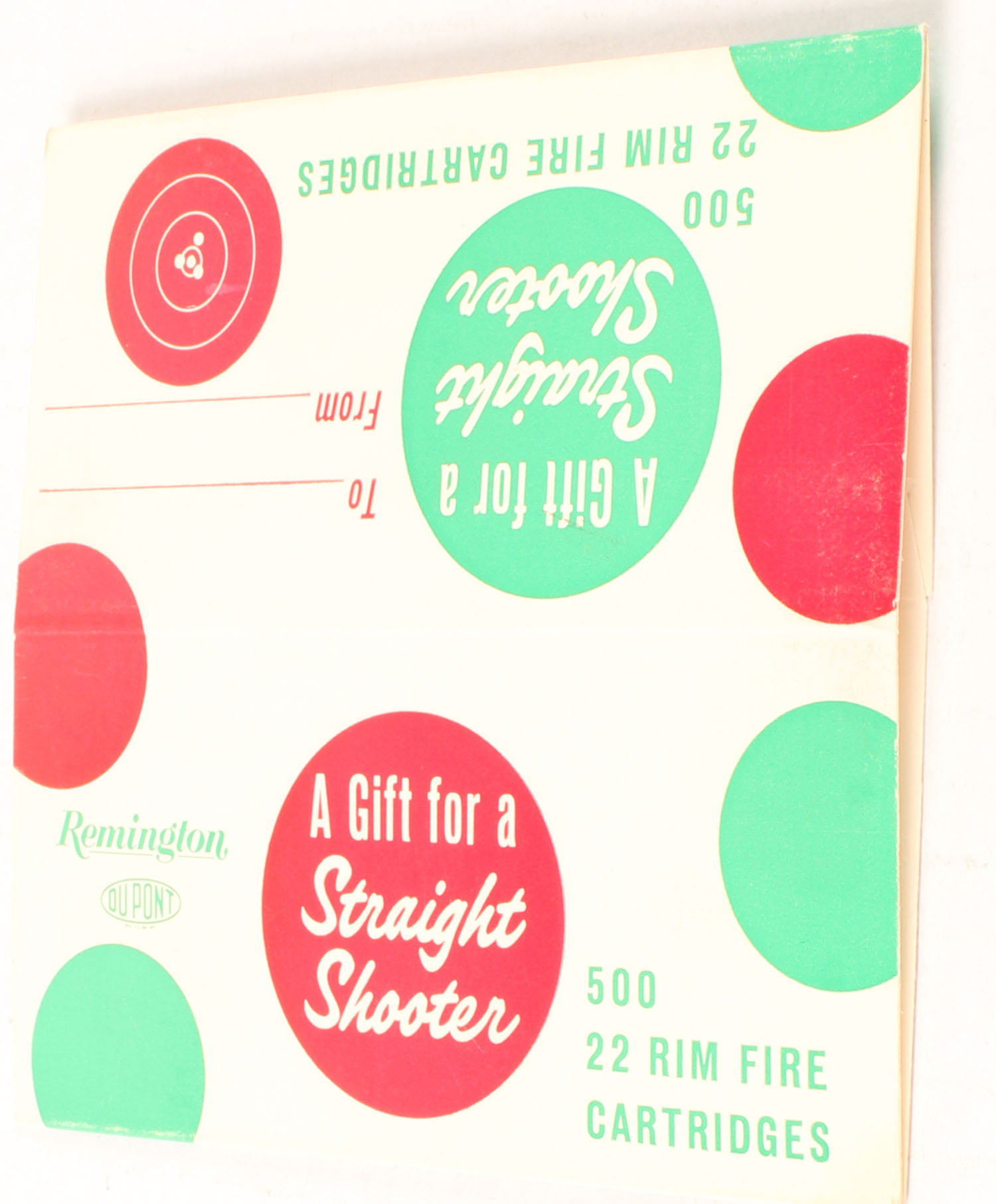 Remington, A Gift for a Straight Shooter, New old stock Christmas sleeve for .22 bricks, sleeve is near mint with minty color, only very minor edge wear. Grade: Excellent ++ - Value: 60 to 90