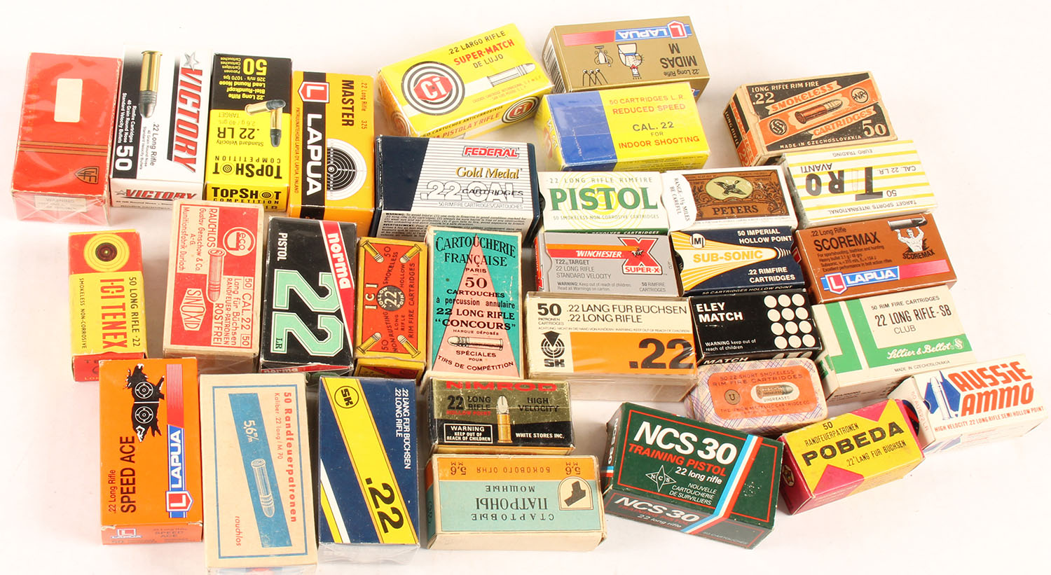 Mixed Mfg. Lot of (32) Empty .22 rim fire boxes. Grade: Very Good ++ - Value: 10 to 50