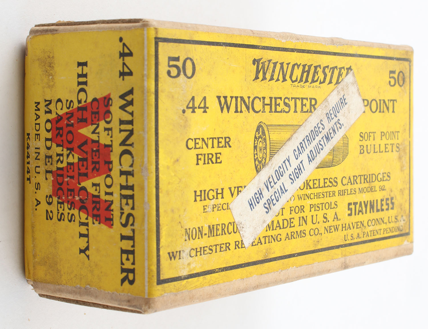 Winchester, Staynless, .44 Winchester, Smokeless, FULL & SEALED, 2pc. Buff box with yellow wraparound label, has white High Velocity over-label, box is solid with very good color, some age soiling, shelf wear, very minor edge & corner wear, labels are intact. Grade: Excellent - Value: 300 to 450