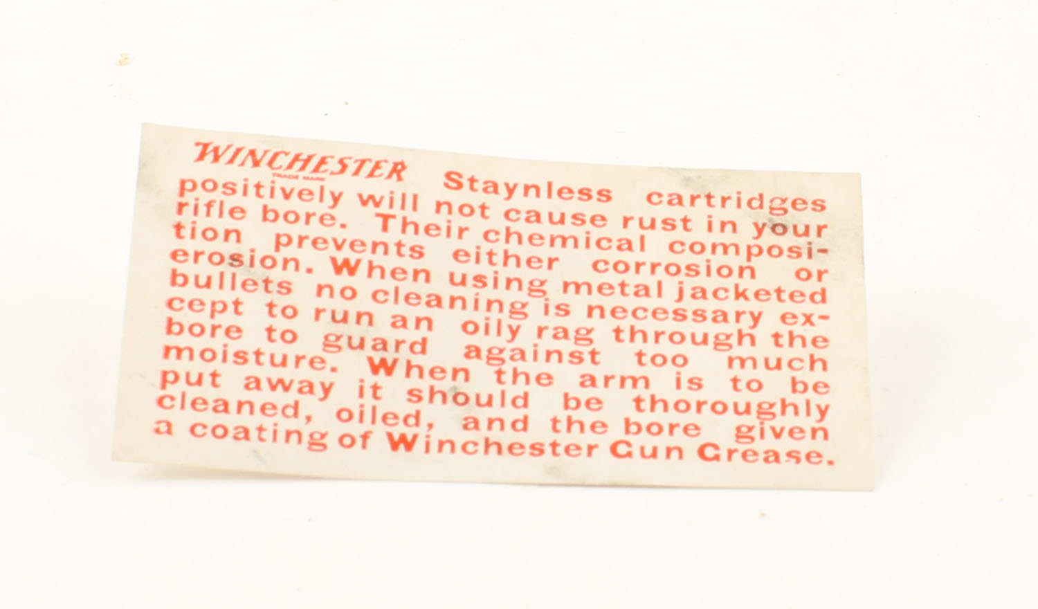 Winchester, Staynless - Non-Mercuric, .375 H&H Magnum, 235 Grain Open Point Exp., Full & Half Sealed with Insert, 2pc. Buff box with yellow black & red labels, box is solid with very good color, box has light age soiling & scuffing, top has two seam splits, ammo is excellent. Grade: Very Good ++ - Value: 40 to 120