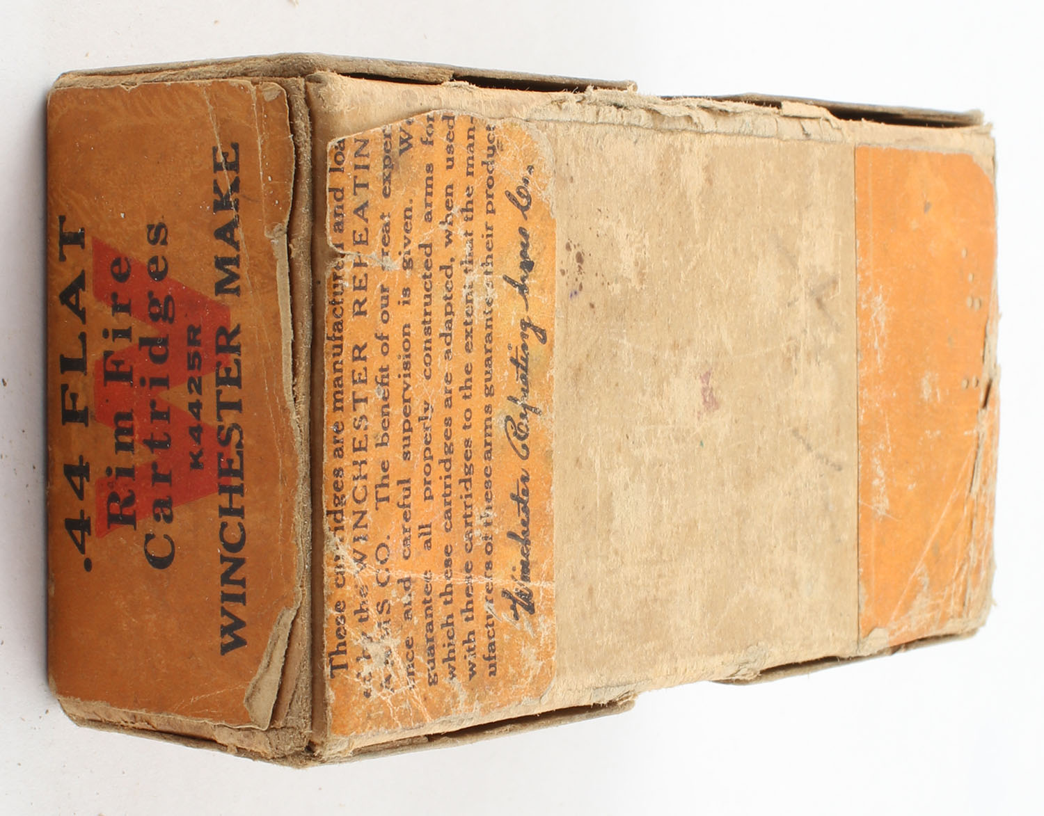 RARE! Winchester, .44 Flat Rim Fire Cartridges, Full, 2pc. Buff box with green & orange wraparound label, box is solid with age soiling to label & box, minor edge & corner wear, label is intact, ammo is good. Grade: Very Good ++ - Value: 1500 to 2000