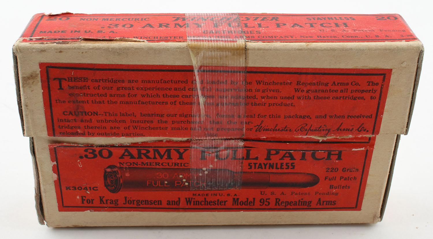 Winchester, Non-Mercuric Staynless, .30 Army (.30-40 Krag), 220 Grain Full Patch Bullets, Full, 2pc. Buff box with red labels, box is solid with excellent color, very minor shelf & corner wear, labels are intact, ammo is poor. Grade: Very Good - Value: 20 to 60