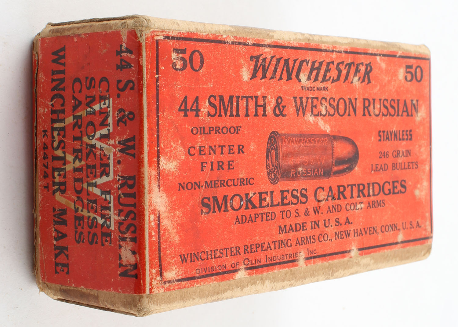 Winchester, Smokeless Cartridges, .44 Smith & Wesson Russian, 246 Grain Lead Bullets, Partial 48rds., 2pc. Buff box with red wraparound label, box is solid with very good to excellent color, shelf wear, some corner wear, edge wear, label is intact, ammo is excellent. Grade: Very Good + - Value: 50 to 100