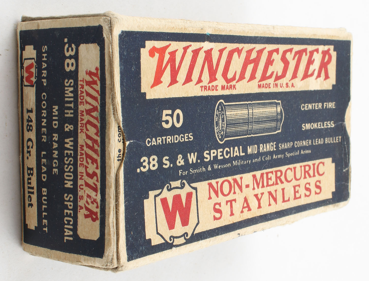 Winchester, Non-Mercuric Staynless, .38 Smith & Wesson Special, 148 Grain Sharp Corner Lead Bullet, Full, 1pc., Blue white & red box, box is very solid with great color, has minor edge & corner wear, right end flap is torn, left end flap is solid, ammo is excellent. Grade: Very Good ++ - Value: 20 to 100