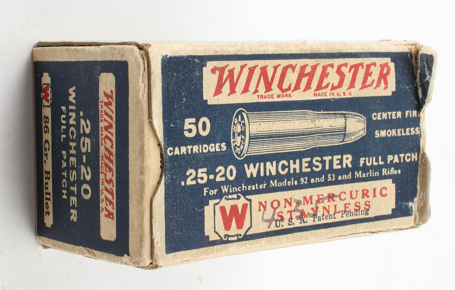 Winchester, Non-Mercuric Staynless, .25-20 Winchester, Full, 1pc., 86 Grain Full Patch, Blue white & red box, box is solid with great color, has corner & edge wear, end flaps are solid, ammo is excellent. Grade: Very Good + - Value: 50 to 150