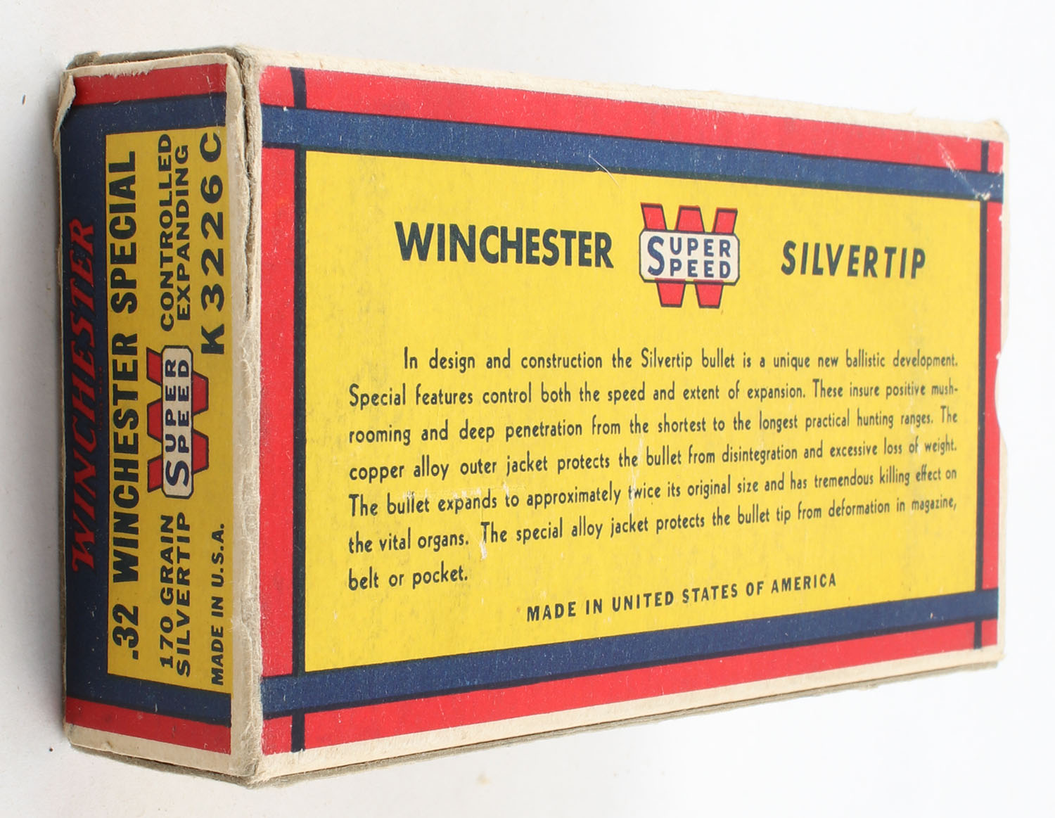 Winchester, Silvertip, .32 Winchester Special, 170 Grain Controlled Expanding Bullet, Full, 1pc., yellow blue & red bear box, box is solid with excellent color, box has light edge & corner wear, end flaps are solid, ammo is very good. Grade: Excellent - Value: 80 to 200