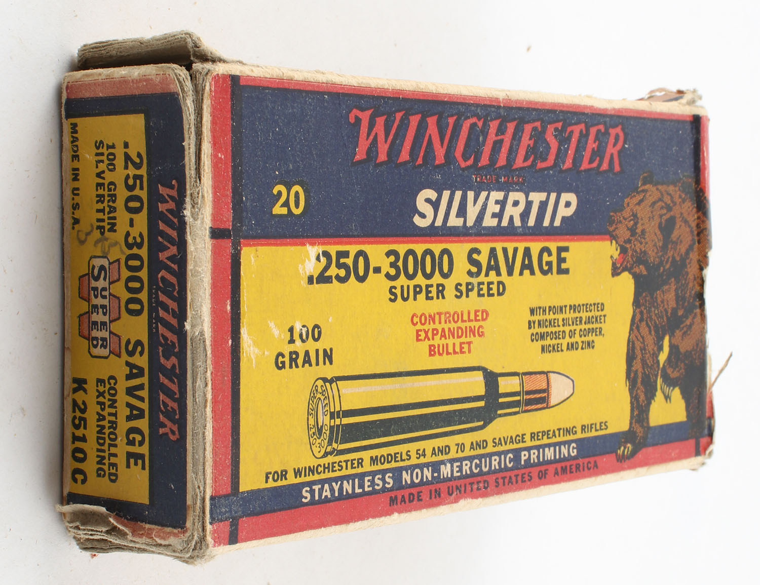 Winchester, Silvertip, .250-3000 Savage, 100 Gr. Controlled Expanding Bullet, Super Speed, 1pc, Partial 19rds with 16rds. Being correct, yellow blue & red bear box, box has edge & corner wear, has a torn right end flap, ammo is very good. Grade: Good ++ - Value: 50 to 75