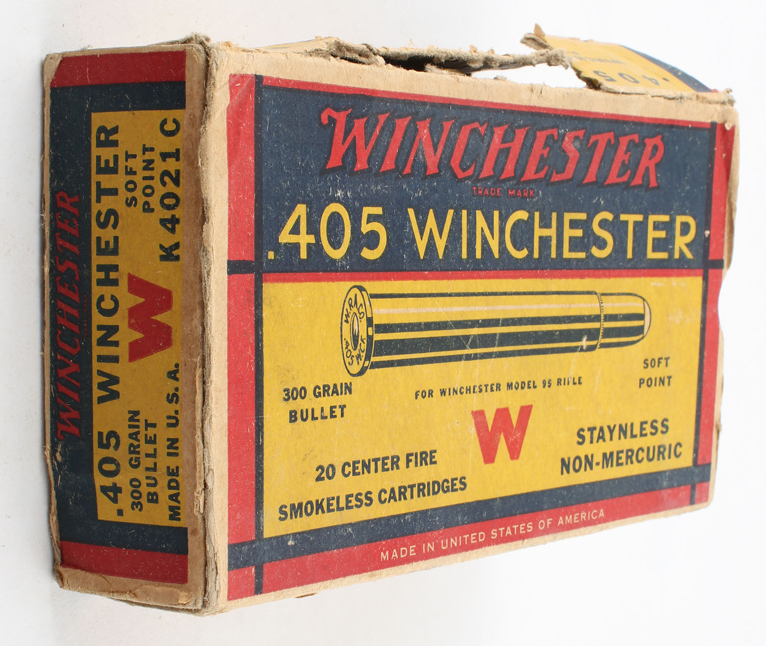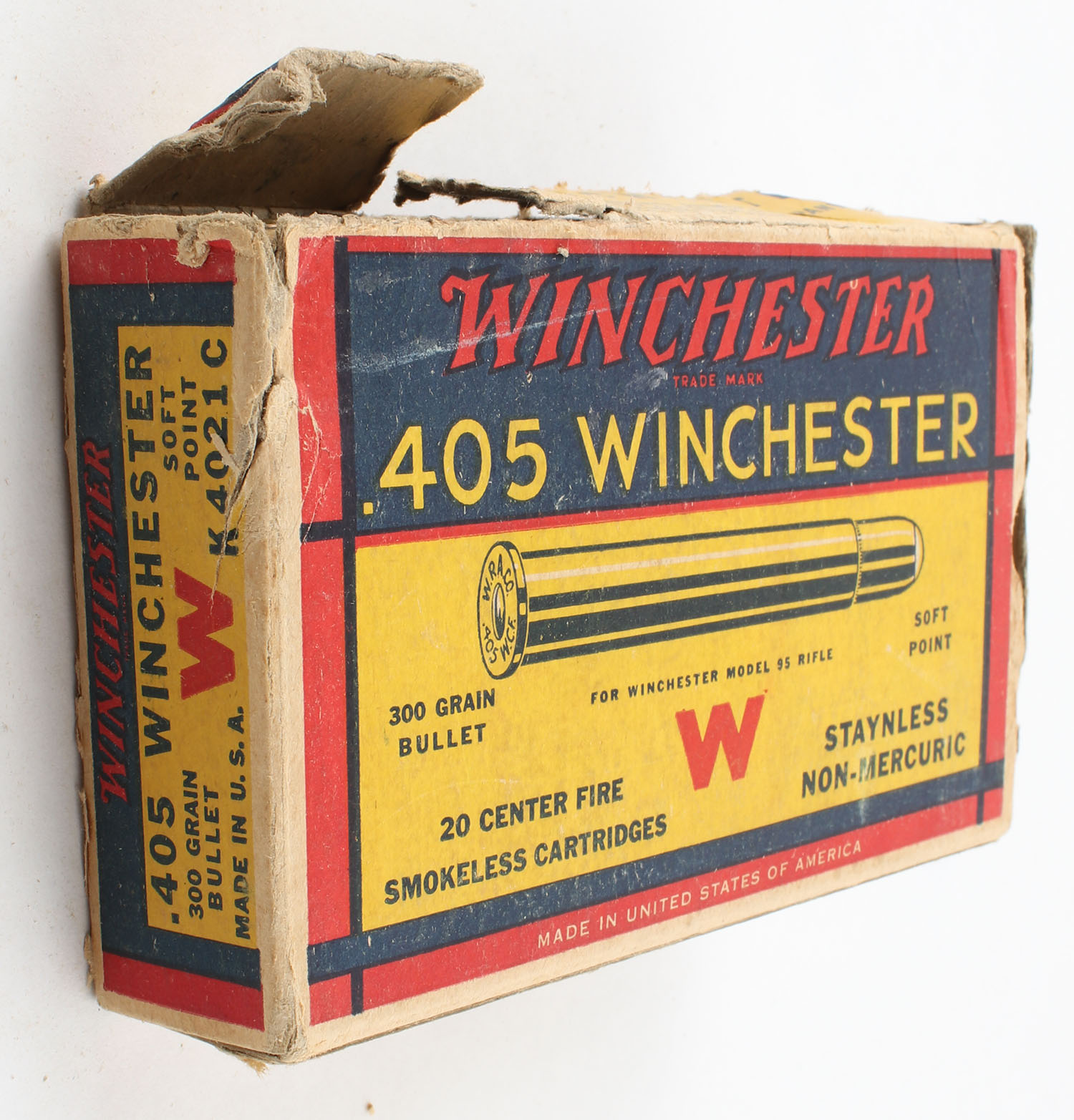 Winchester, .405 Winchester, 300 Gr. Soft point Bullet, 1pc, Full, Yellow blue & red box, box has light age soiling with a torn left end flap, side has partial tears, edge & corner wear, right end flap is partially torn, ammo is excellent. Grade: Good + - Value: 50 to 150