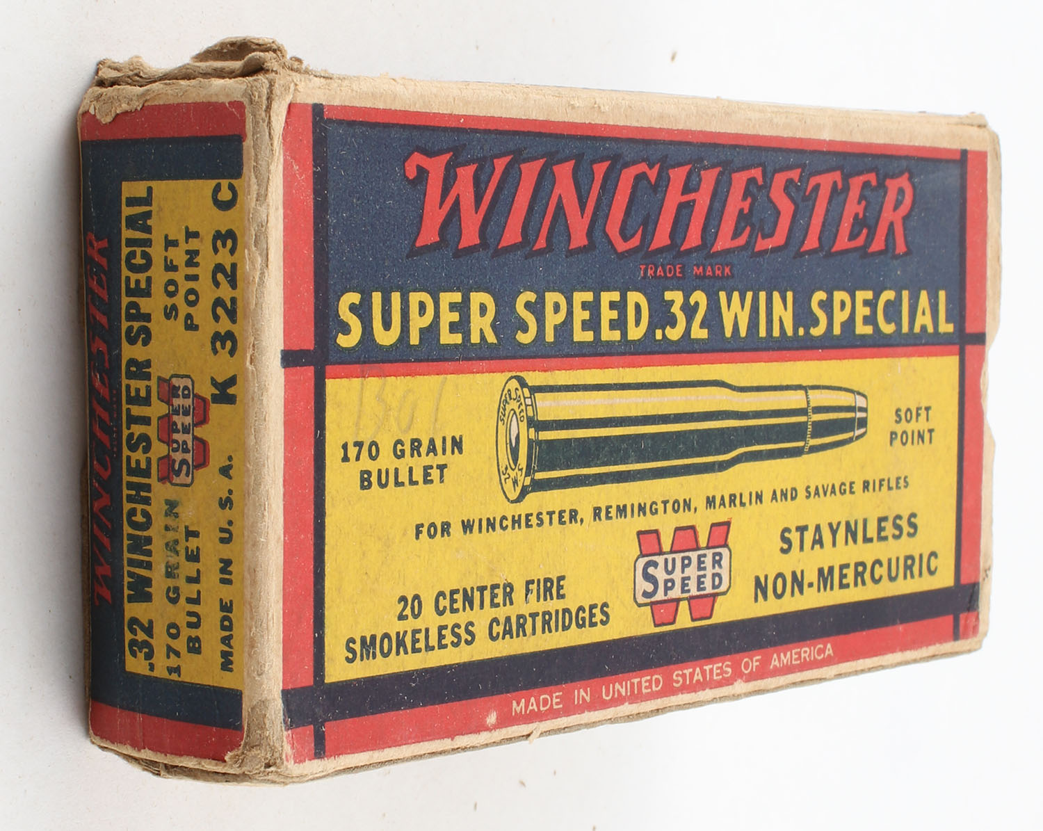 Winchester, Super Speed, .32 Winchester Special, 170 Grain Soft Point Bullet, Full, 1pc. Yellow blue & red box, box has scuffing with edge & corner wear, end flaps are solid, ammo is good to very good. Grade: Very Good - Value: 50 to 150