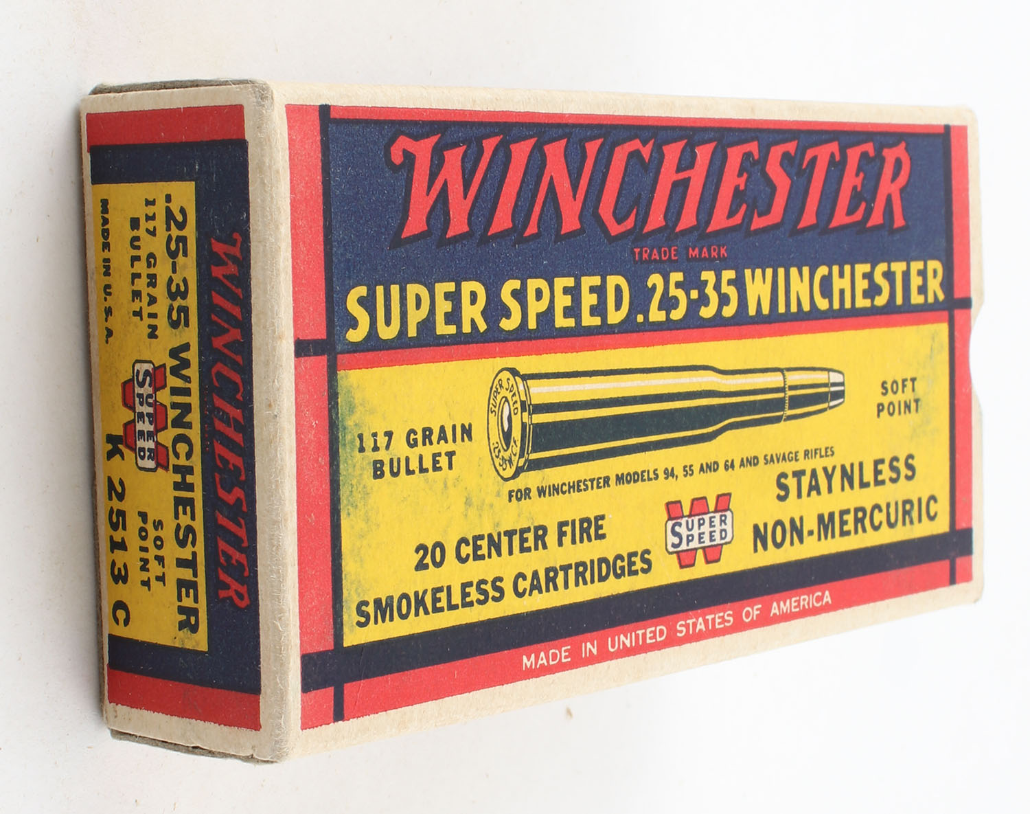 Winchester, Super Speed, .25-35 Winchester, 117 Grain Soft Point Bullet, Full, 1pc. Yellow blue & red box, box is solid with excellent color, very minor scuffing, end flaps are solid, ammo is excellent. Grade: Excellent + - Value: 60 to 90