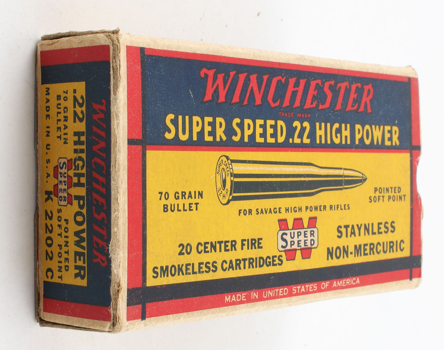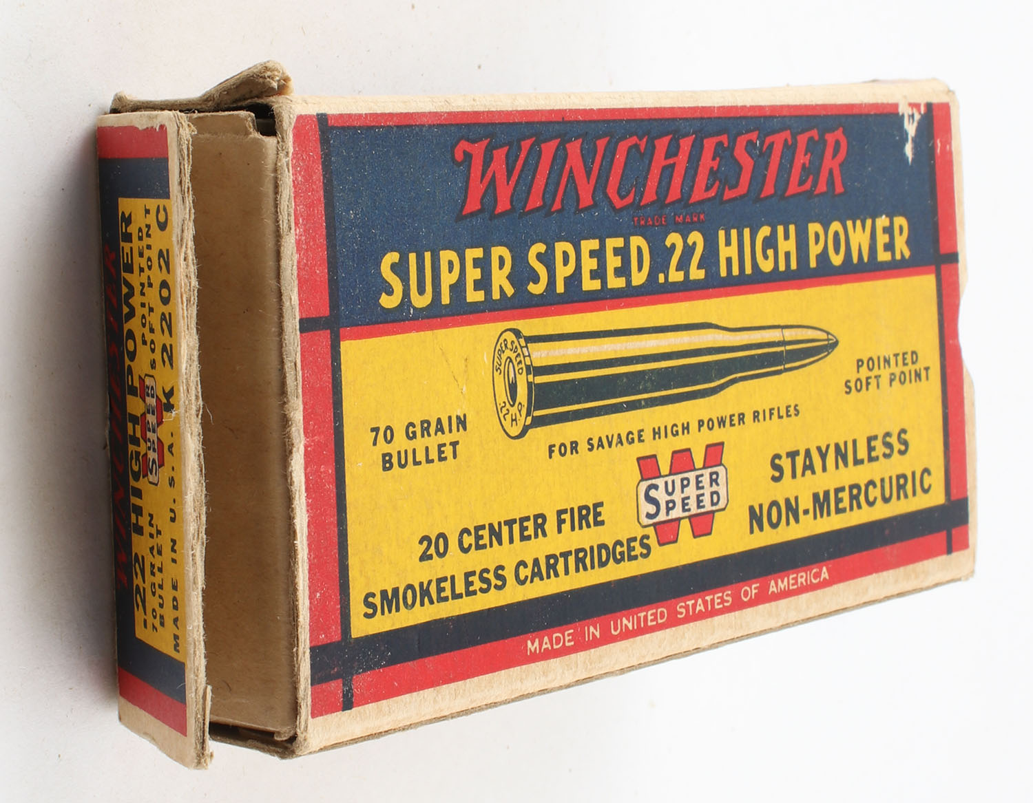 Winchester, Super Speed, .22 High Power, 70 Grain Pointed Soft Point Bullet, Full, 1pc. Yellow blue & red box, box is solid with excellent color, has very minor corner wear, right end flap is torn, left end flap is solid, ammo is excellent. Grade: Very Good ++ - Value: 30 to 90