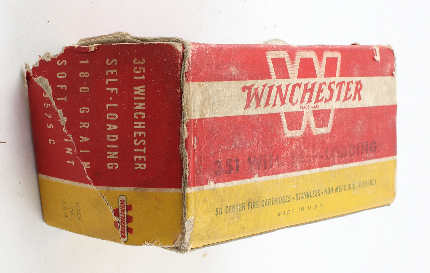 Winchester, .351 Win. Self-Loading, 180 Grain Soft Point, Partial 49rds., 1pc. Red yellow & white box, box has scuffing with edge & corner wear, box is missing left end flap & right end flap is torn, ammo is very good. Grade: Good ++ - Value: 50 to 150