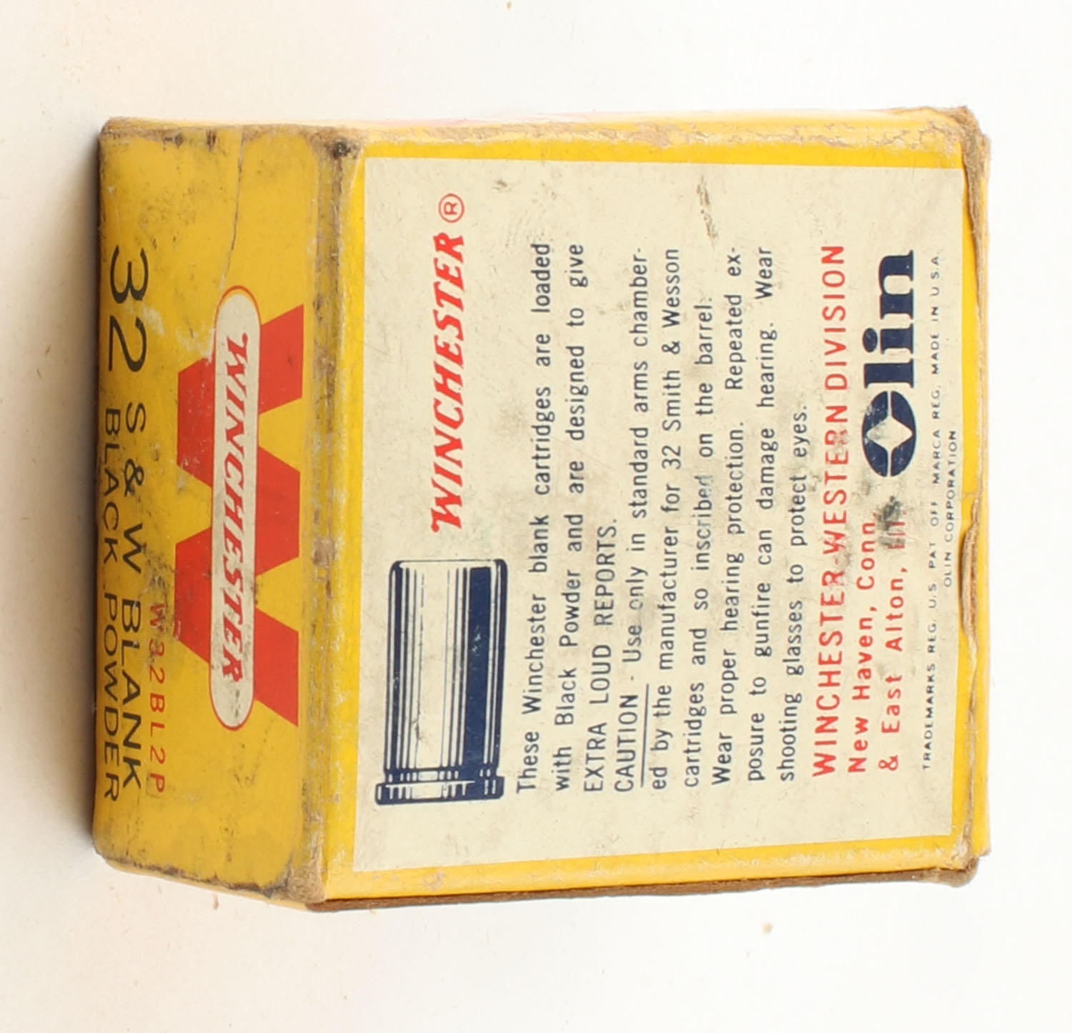 Winchester, Center Fire Blank Cartridges, .32 Smith & Wesson, Black Powder, Full, 1pc. Yellow red & white box, box has age soiling with edge & corner wear, flaps are solid, ammo is excellent. Grade: Good ++ - Value: 10 to 30