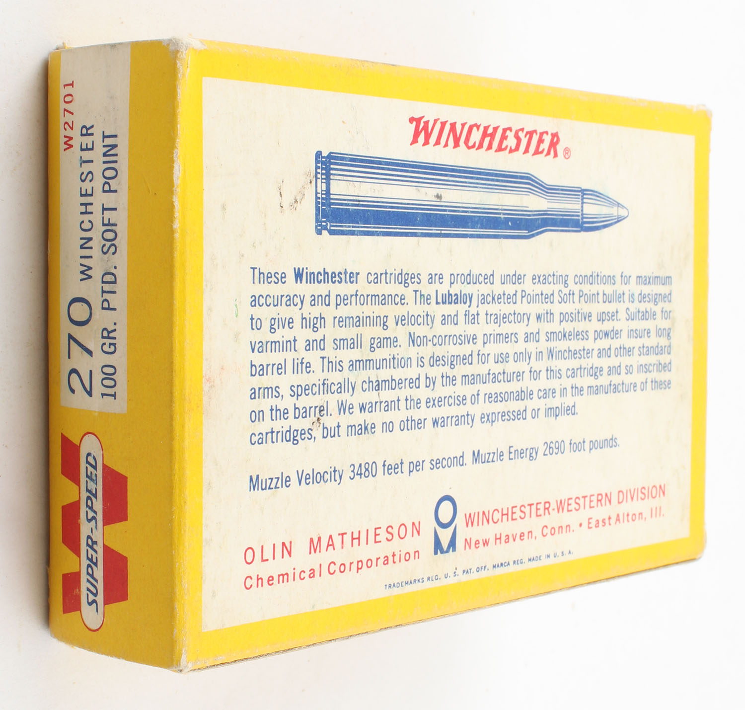 Winchester, Super-Speed, .270 Winchester, 100 Grain Soft Point, Full, 1pc. Yellow Red & white box, box is solid with very good to excellent color, minor age soiling & shelf wear, minor corner wear, end flaps are solid, ammo is excellent. Grade: Excellent - Value: 20 to 60