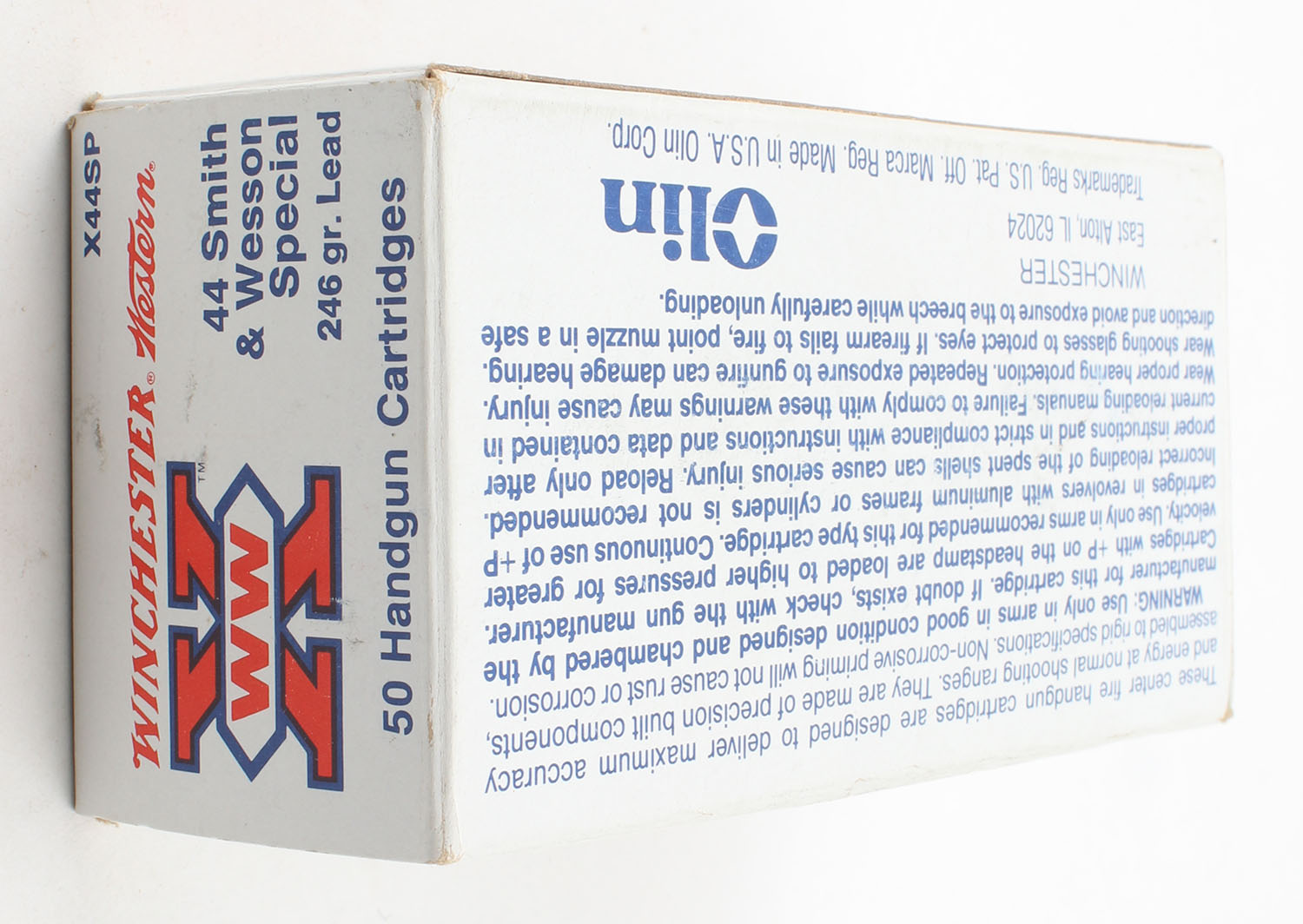 Winchester-Western, X, .44 Smith & Wesson Special, 246 Grain Lead, Partial 30rds., 1pc., White red & black box, box is very solid with excellent color, very minor corner wear, edges are crisp, end flaps are solid, ammo is excellent. Grade: Excellent - Value: 30 to 60