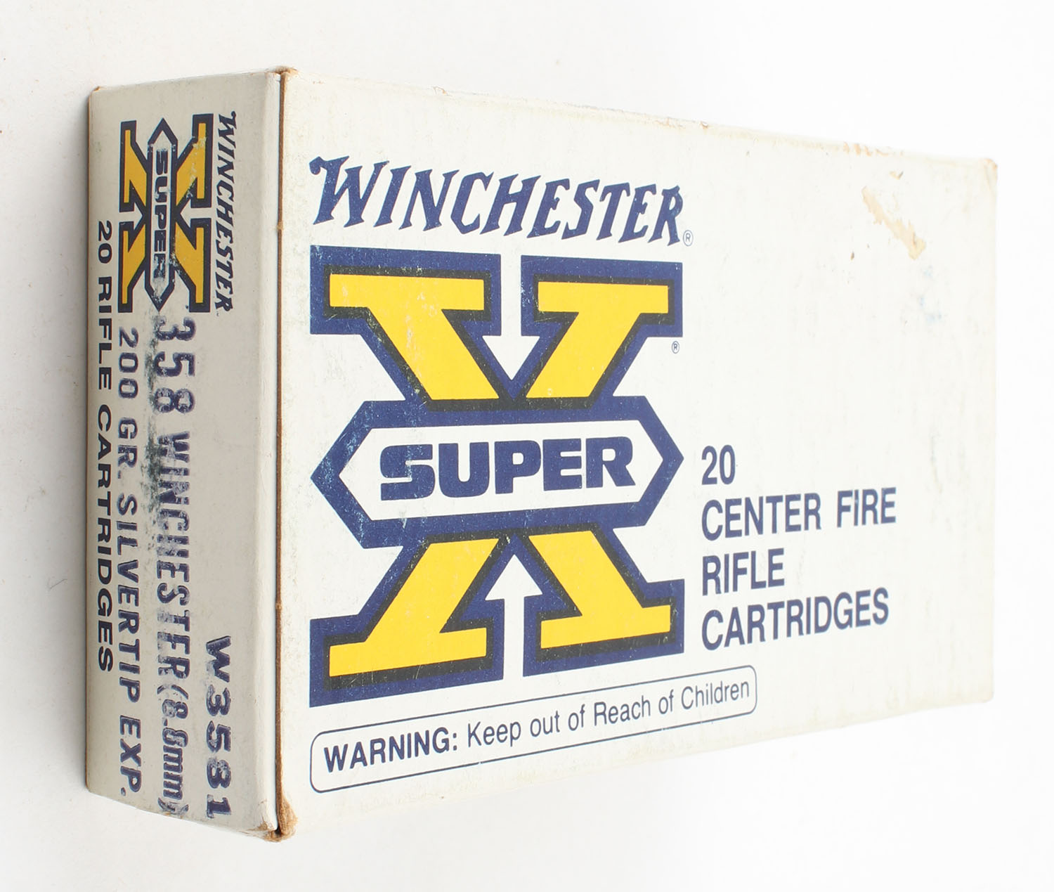 Winchester, Super X, .358 Winchester (8.8mm), 200 Grain Silvertip Expanding, Full, 1pc. White black & yellow box, box is solid with very good to excellent color, has light scuffing with sticker to right flap, end flaps are solid, ammo is very good. Grade: Very Good ++ - Value: 50 to 75