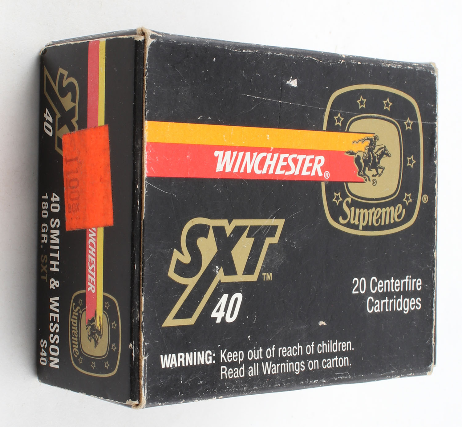 Winchester, Supreme, .40 Smith & Wesson, 180 Grain SXT, Full, 1pc., Black box, box has light age soiling, edge & corner wear, end flaps are solid, ammo is excellent. Grade: Very Good ++ - Value: 40 to 100