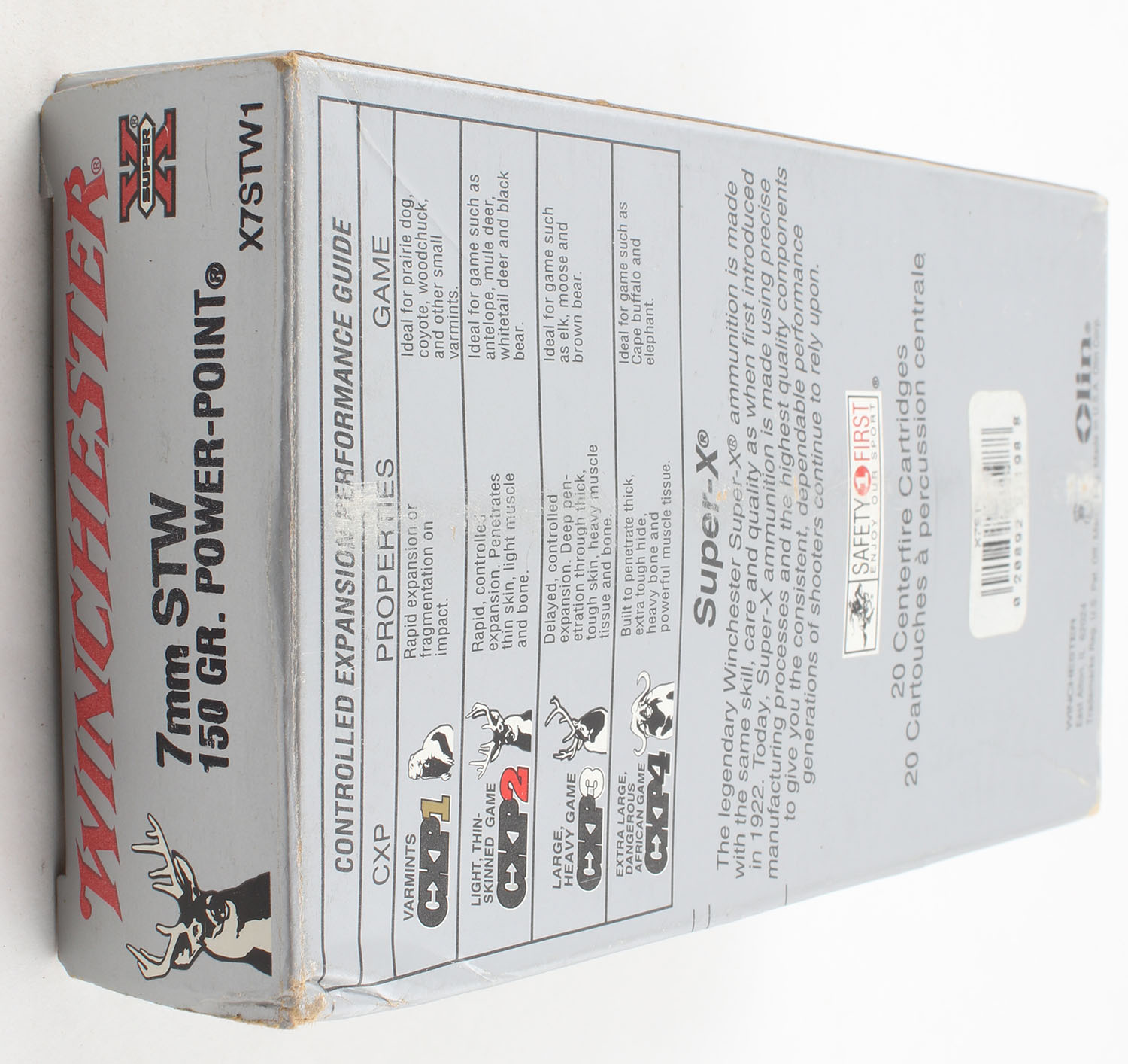 Winchester, Super-X, 7mm STW, 150 Grain Power Point, Full, 1pc., Silver & red box, box is solid with very good color, has light scuffing, some corner wear, end flaps are solid, ammo is excellent. Grade: Excellent - Value: 50 to 75
