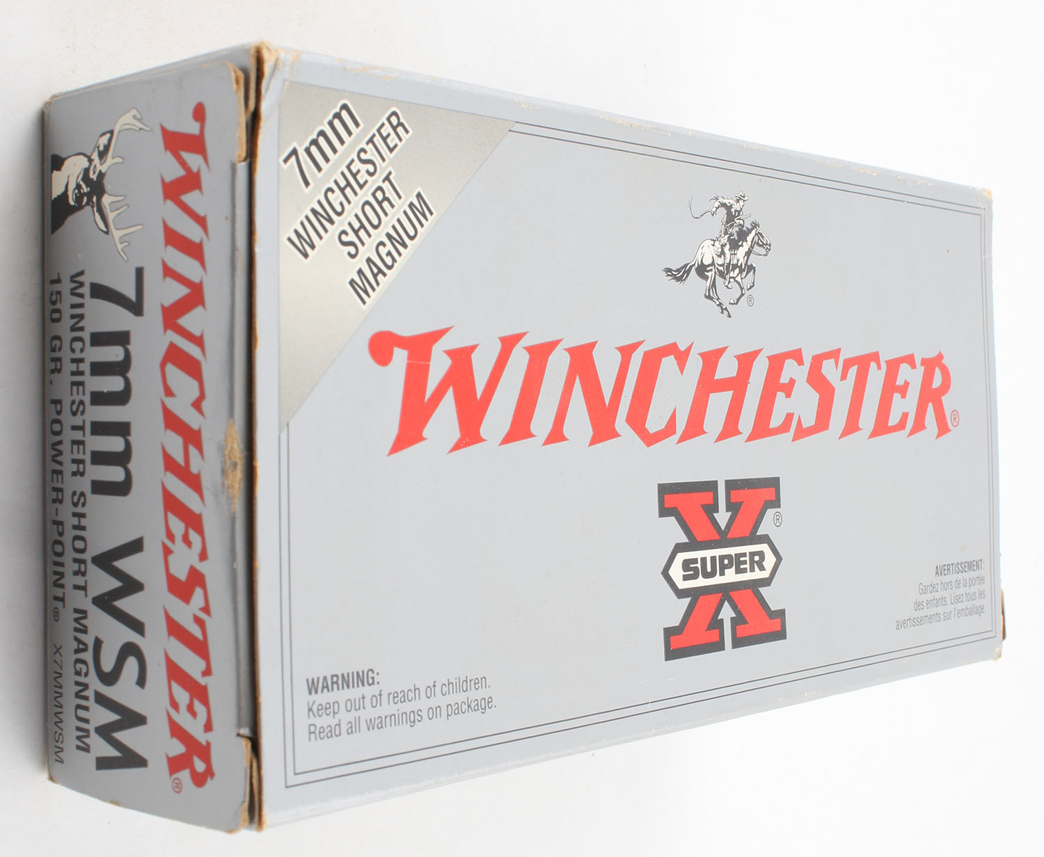 Winchester, Super-X, 7mm WSM, 150 Grain Power Point, Full, 1pc., Silver & red box, box is solid with excellent color, box has light scuffing, minor corner wear, end flaps are solid, ammo is excellent. Grade: Excellent - Value: 30 to 45