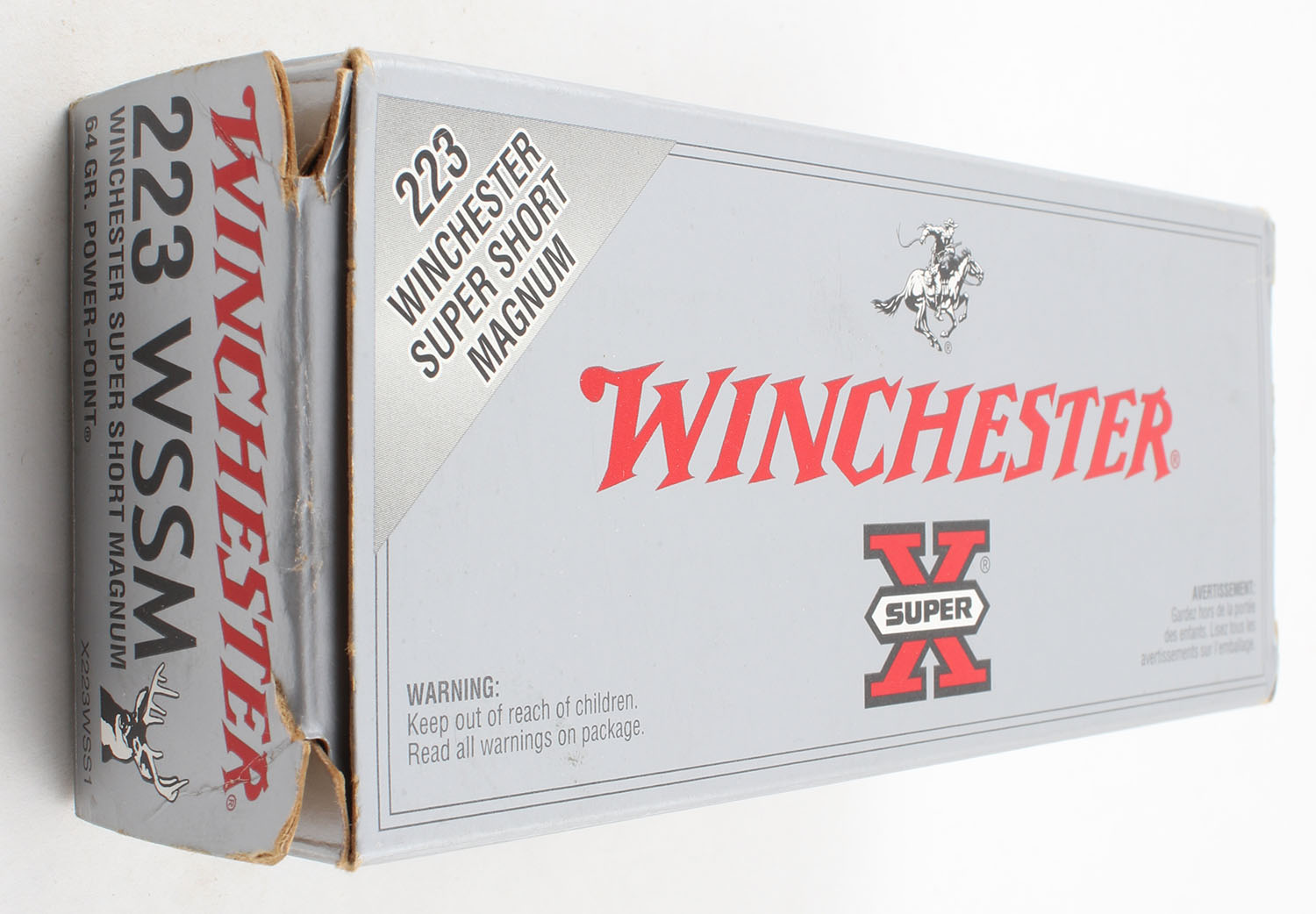 Winchester, Super X, .223 WSSM, 64 Grain Power-Point, Partial 17rds., 1pc. Gray & red box, box is very solid with excellent color, has minor corner wear, end flaps are solid, ammo is minty. Grade: Very Good ++ - Value: 20 to 60