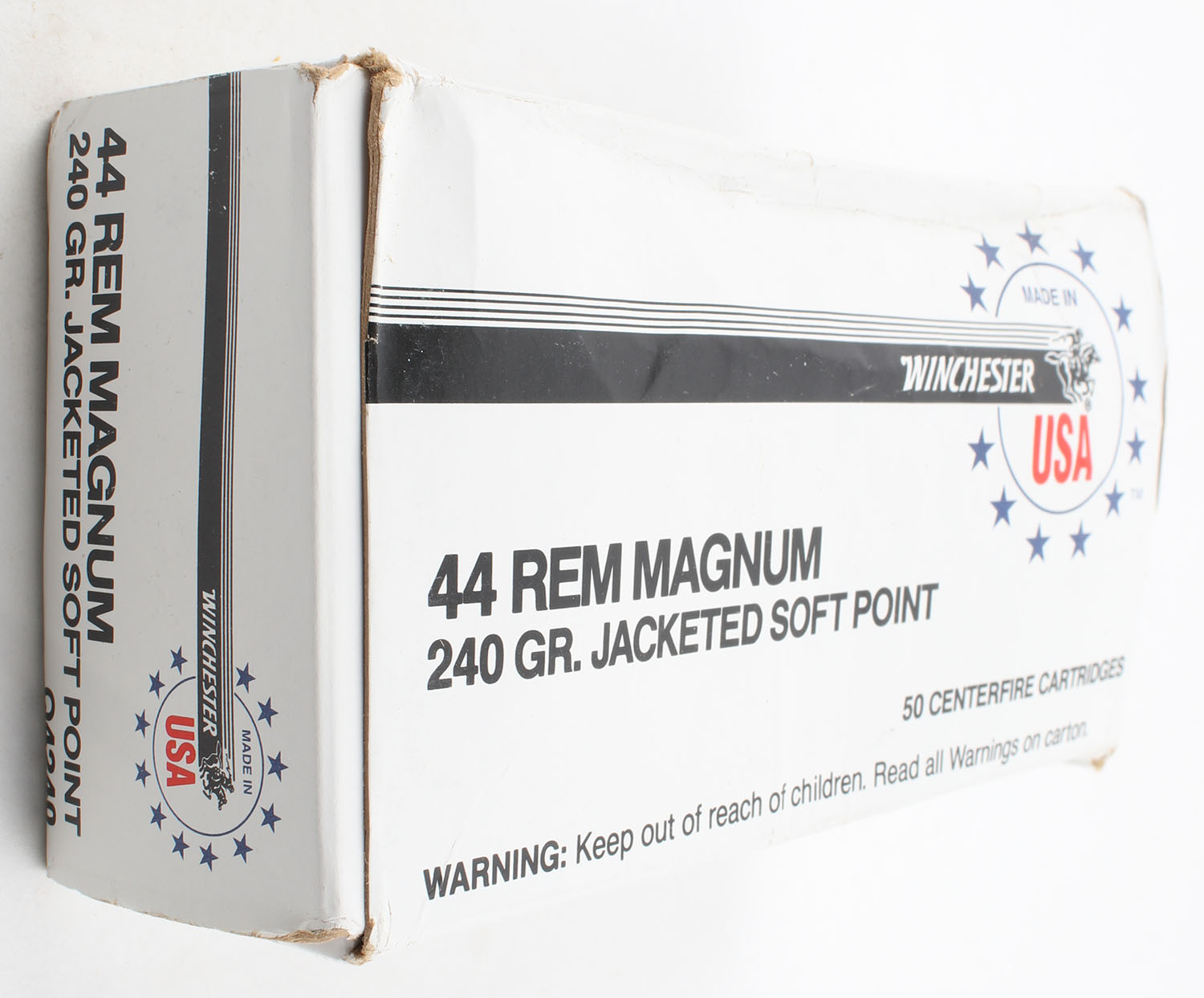 Winchester, USA, .44 Remington Magnum, 240 Grain Jacketed Soft Point, Appears Full, 1pc. White red & black box, box has scuffing with rub marks, end flaps are solid, ammo is excellent. Grade: Very Good - Value: 20 to 60