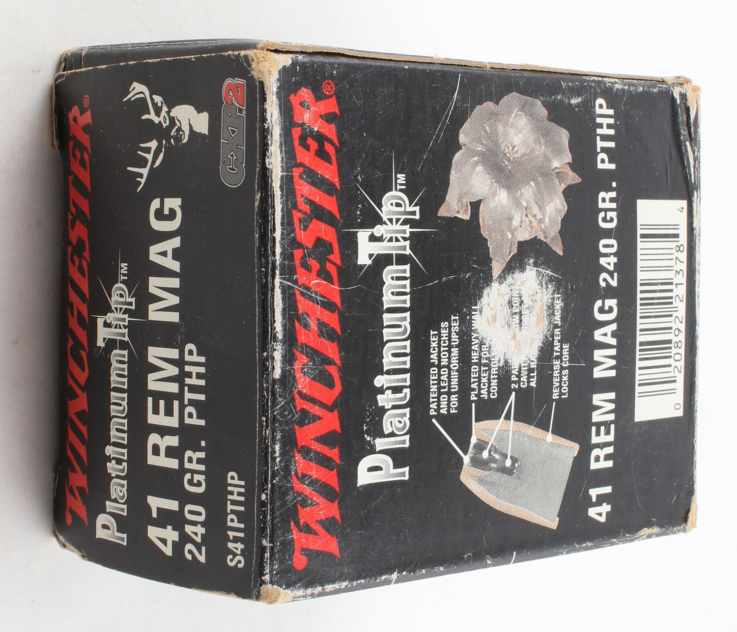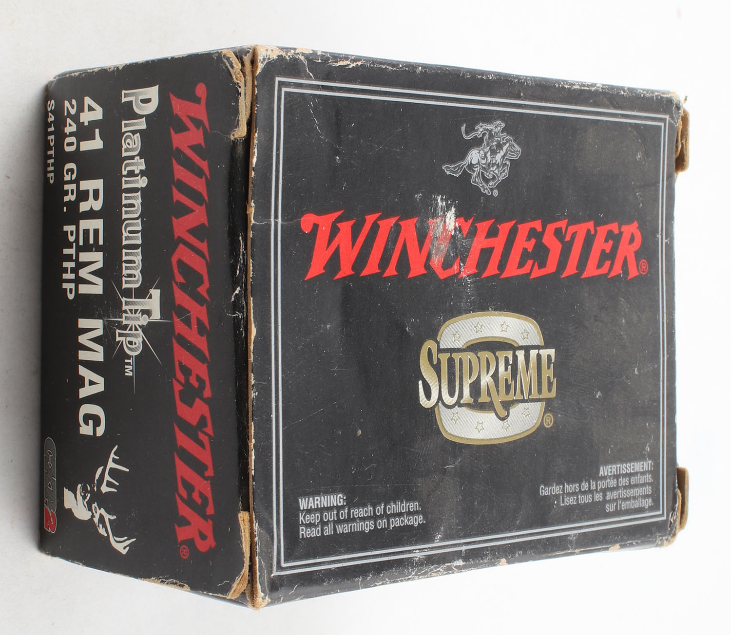 Winchester, Supreme, .41 Rem. Mag., 240 Grain Platinum Tip HP, Full, 1pc. Black & red box, box is solid with good color, has scuffing with edge & corner wear, end flaps are solid, ammo is excellent. Grade: Very Good ++ - Value: 20 to 50