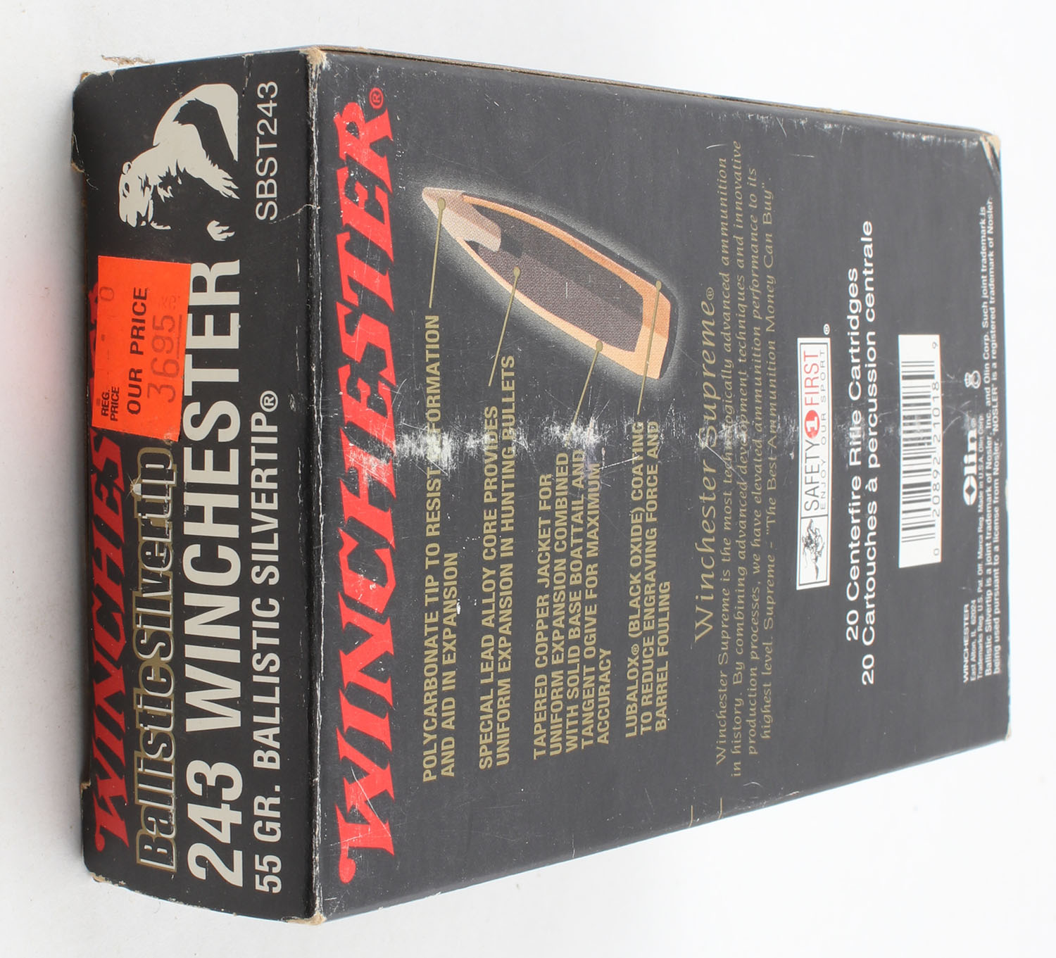 Winchester, Supreme, .243 Winchester, 55 Gr. Ballistic Silvertip, Full, 1pc. Black red & gold box, box is very solid with excellent color, box has light scuffing, end flaps are solid, ammo is minty. Grade: Excellent - Value: 20 to 60