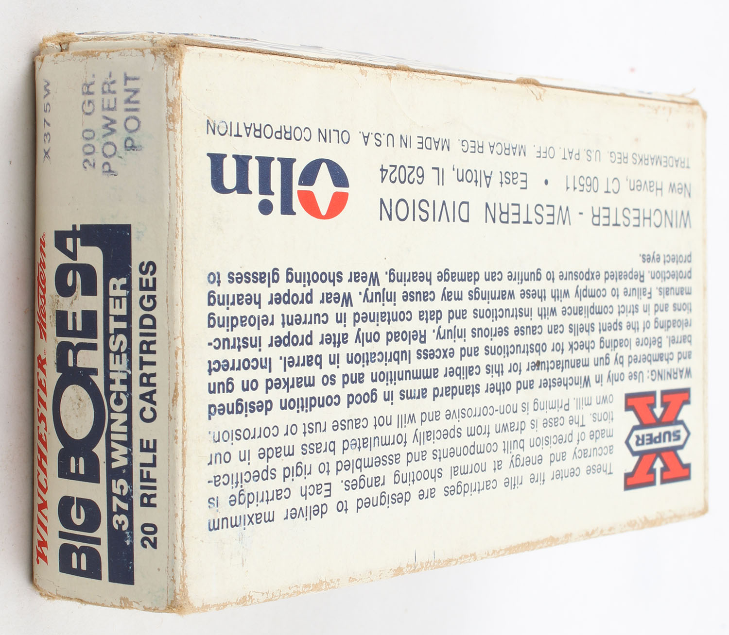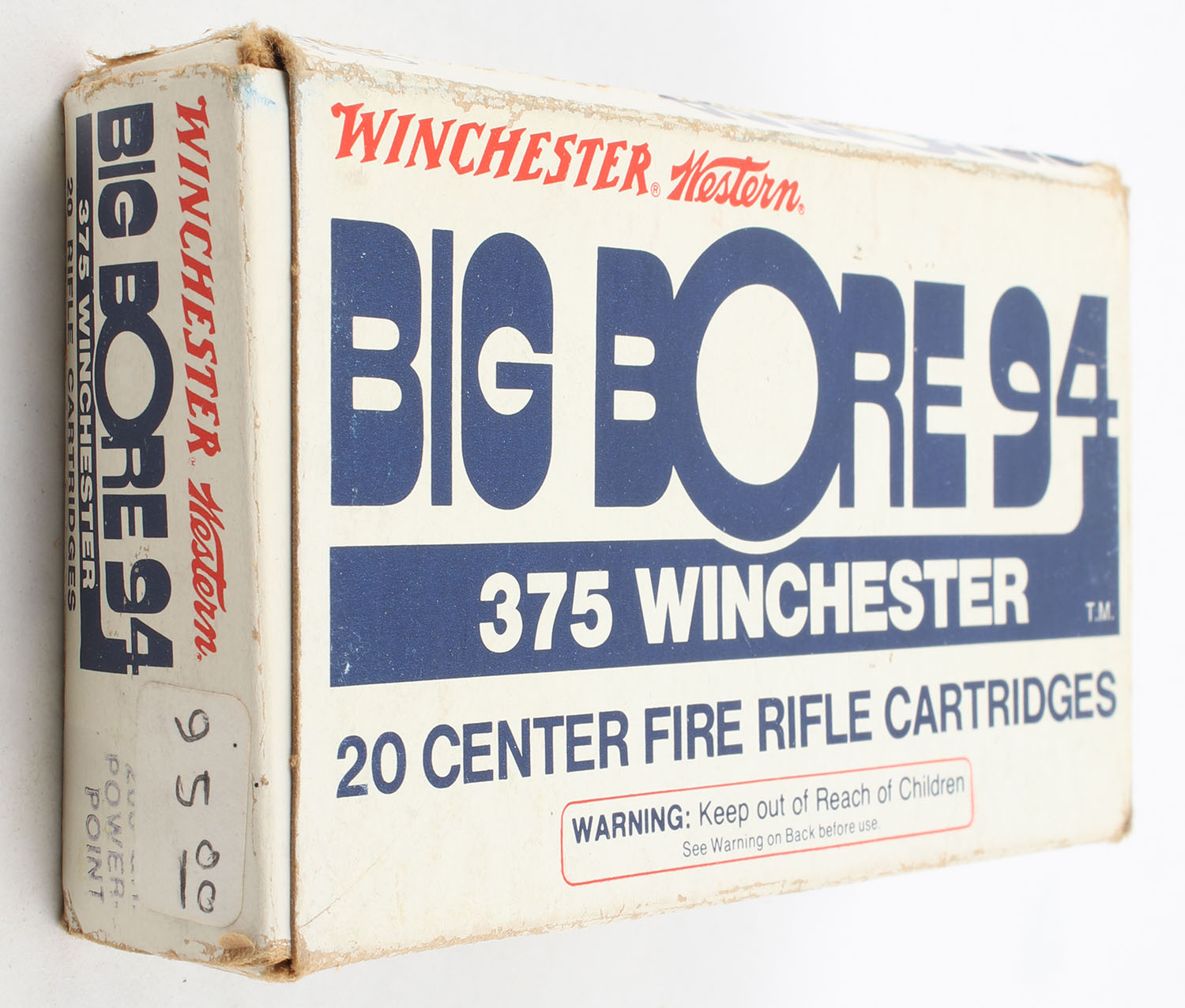 Winchester, Big Bore 94, .375 Winchester, 200 Grain Power-Point, Full, 1pc., White blue & red box, box is solid with good color, has light age soiling, edge & corner wear, end flaps are solid , ammo is very good to excellent. Grade: Very Good ++ - Value: 80 to 120