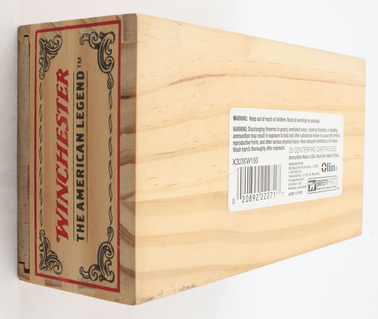 Winchester, The American Legend, 150 Year Commemorative, .30-30 Win., 150 Grain Power-Point, Full, 1pc., Wood box with silver & red box inside, wood box is mint with minty color, inside box is mint with minty color, ammo is mint. Grade MINT - Value: 60 to 120