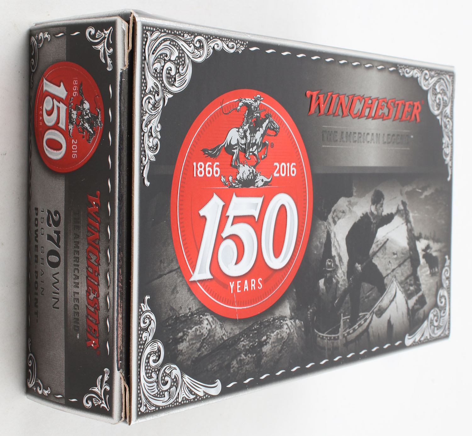 Winchester, The American Legend, 150 Year Commemorative box, .270 Winchester, 150 Grain Power-Point, Full, 1pc. Silver & red box, box is MINT with minty color, corners are sharp, edges are crisp, end flaps are solid, ammo is minty. Grade: MINT - Value: 60 to 90