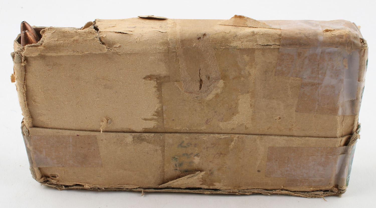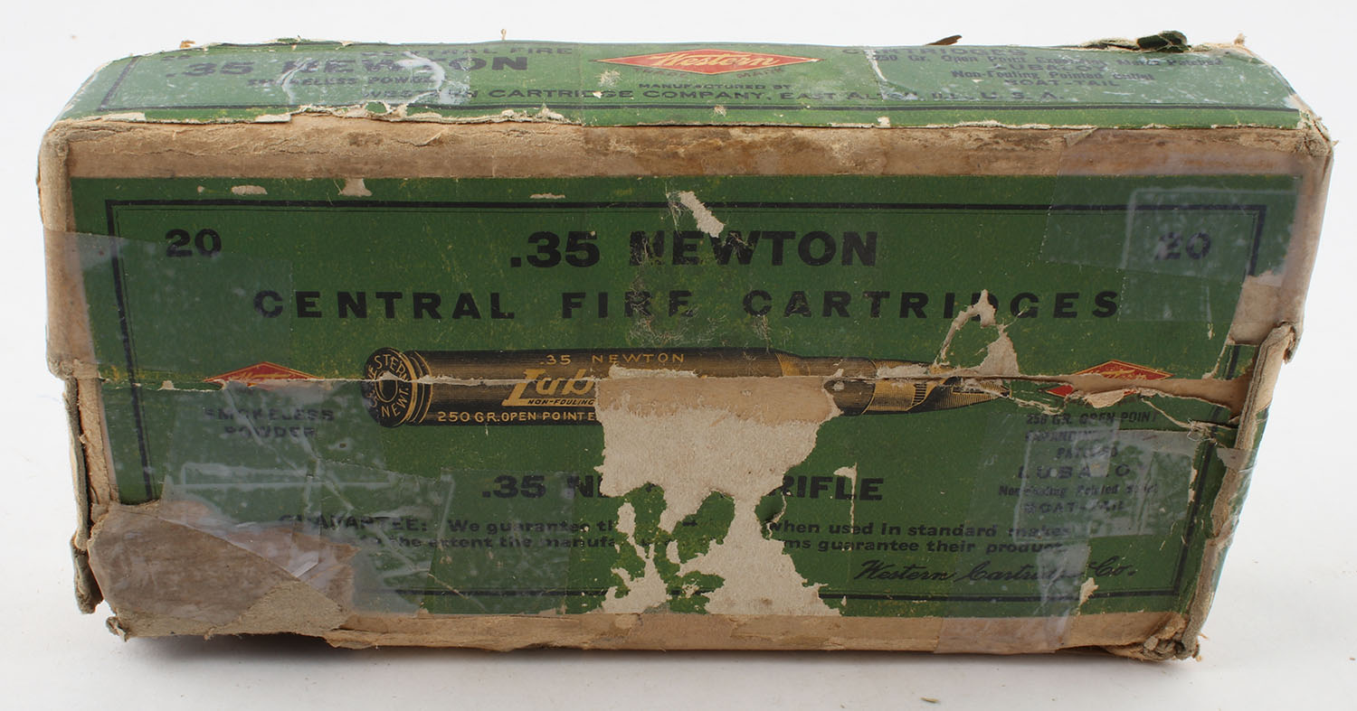 Western, .35 Newton, 250 Grain Open Point Expanding Metal Patched LUBALOY boat tail pointed bullet, smokeless, 2pc. Full, Buff box with green label & black & red print, box has age soiling with scuffing, edge & corner wear, partial tear to bottom, seam split to top, tape repairs, ammo is very good. Grade: Good - Value: 50 to 75