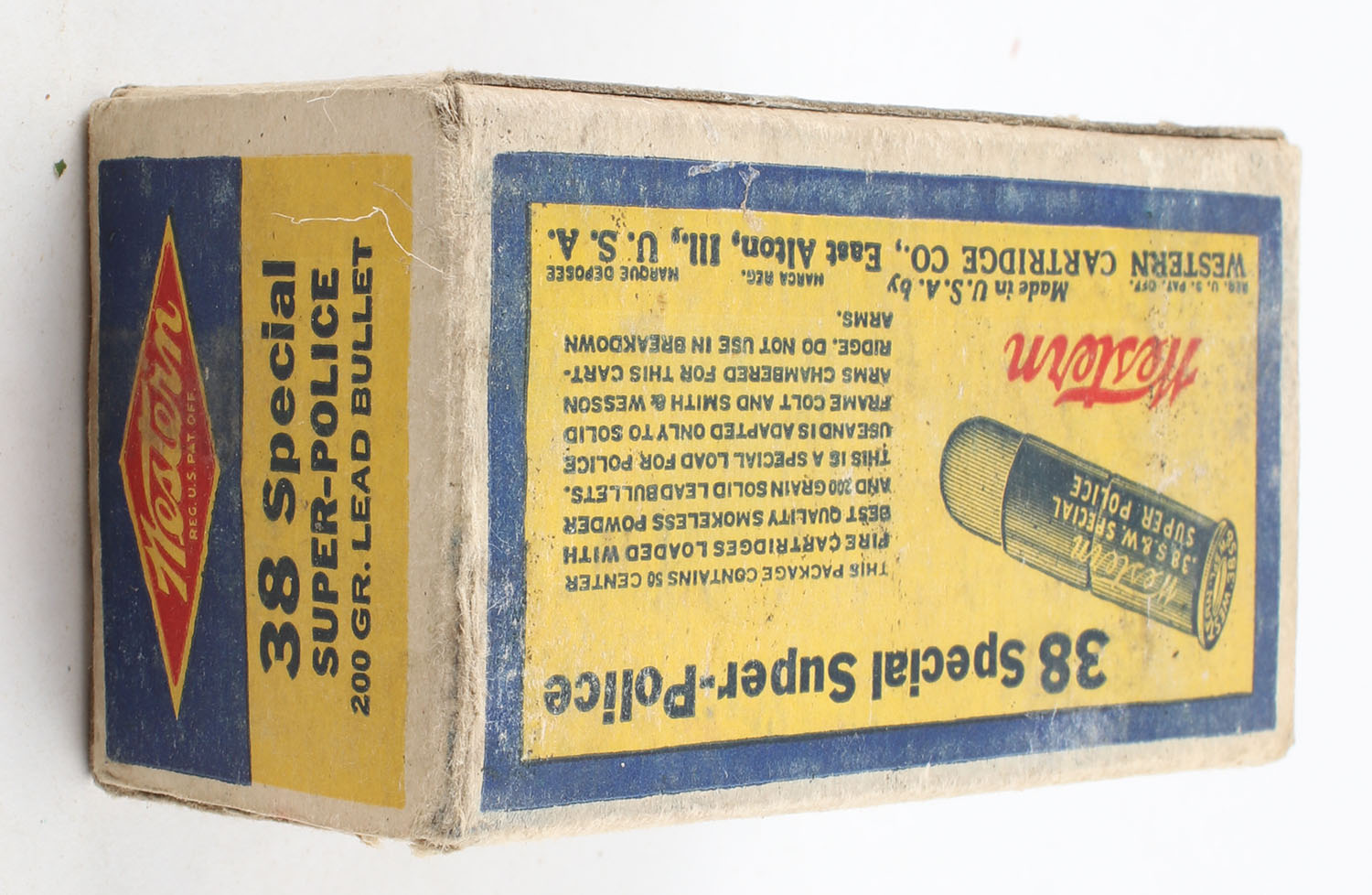 Western, Cartridges, .38 Special Super-Police, 200 Grain Lead Bullet, Partial 47rds., 1pc. Yellow blue & red bullseye box, box is solid with very good color, has light age soiling with some scuffing, light edge & corner wear, end flaps are solid, ammo is very good. Grade: Very Good ++ - Value: 20 to 60