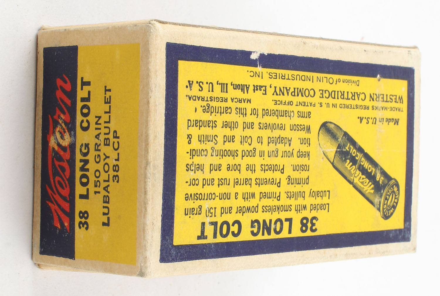 Western, Cartridges, .38 Long Colt, Center Fire, 150 Grain Lubaloy Bullet, Smokeless Powder, Partial 49rds. With 37rds. Being correct, 1pc. Blue yellow & red bulls eye box, box is very solid with excellent color, has minor shelf wear, end flaps are solid, ammo is very good. Grade: Excellent - Value: 30 to 90