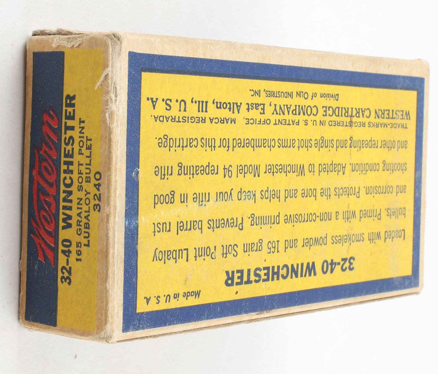Winchester, Cartridges, .32-40 Winchester, Center Fire, 165 Grain Soft Point Lubaloy Bullet, Full, 1pc. Yellow blue & red bulls eye box, box is solid with excellent color, has light edge & corner wear, light shelf wear, end flaps are solid, ammo is very good. Grade: Very Good ++ - Value: 80 to 120